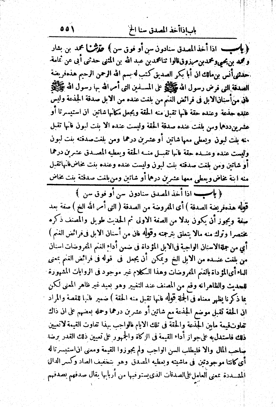 1800 - حَدَّثَنَا مُحَمَّدُ بْنُ بَشَّارٍ وَمُحَمَّدُ بْنُ يَحْيَى وَمُحَمَّدُ بْنُ مَرْزُوقٍ قَالُوا حَدَّثَنَا مُحَمَّدُ بْنُ عَبْدِ اللَّهِ بْنِ الْمُثَنَّى حَدَّثَنِي أَبِي عَنْ ثُمَامَةَ حَدَّثَنِي أَنَسُ بْنُ مَالِكٍ «أَنَّ أَبَا بَكْرٍ الصِّدِّيقَ كَتَبَ لَهُ بِسْمِ اللَّهِ الرَّحْمَنِ الرَّحِيمِ هَذِهِ فَرِيضَةُ الصَّدَقَةِ الَّتِي فَرَضَ رَسُولُ اللَّهِ صَلَّى اللَّهُ عَلَيْهِ وَسَلَّمَ عَلَى الْمُسْلِمِينَ الَّتِي أَمَرَ اللَّهُ عَزَّ وَجَلَّ بِهَا رَسُولَ اللَّهِ صَلَّى اللَّهُ عَلَيْهِ وَسَلَّمَ فَإِنَّ مِنْ أَسْنَانِ الْإِبِلِ فِي فَرَائِضِ الْغَنَمِ مَنْ بَلَغَتْ عِنْدَهُ مِنْ الْإِبِلِ صَدَقَةُ الْجَذَعَةِ وَلَيْسَ عِنْدَهُ جَذَعَةٌ وَعِنْدَهُ حِقَّةٌ فَإِنَّهَا تُقْبَلُ مِنْهُ الْحِقَّةُ وَيَجْعَلُ مَكَانَهَا شَاتَيْنِ إِنْ اسْتَيْسَرَتَا أَوْ عِشْرِينَ دِرْهَمًا وَمَنْ بَلَغَتْ عِنْدَهُ صَدَقَةُ الْحِقَّةِ وَلَيْسَتْ عِنْدَهُ إِلَّا بِنْتُ لَبُونٍ فَإِنَّهَا تُقْبَلُ مِنْهُ بِنْتُ لَبُونٍ وَيُعْطِي مَعَهَا شَاتَيْنِ أَوْ عِشْرِينَ دِرْهَمًا وَمَنْ بَلَغَتْ صَدَقَتُهُ بِنْتَ لَبُونٍ وَلَيْسَتْ عِنْدَهُ وَعِنْدَهُ حِقَّةٌ فَإِنَّهَا تُقْبَلُ مِنْهُ الْحِقَّةُ وَيُعْطِيهِ الْمُصَدِّقُ عِشْرِينَ دِرْهَمًا أَوْ شَاتَيْنِ وَمَنْ بَلَغَتْ صَدَقَتُهُ بِنْتَ لَبُونٍ وَلَيْسَتْ عِنْدَهُ وَعِنْدَهُ بِنْتُ مَخَاضٍ فَإِنَّهَا تُقْبَلُ مِنْهُ ابْنَةُ مَخَاضٍ وَيُعْطِي مَعَهَا عِشْرِينَ دِرْهَمًا أَوْ شَاتَيْنِ وَمَنْ بَلَغَتْ صَدَقَتُهُ بِنْتَ مَخَاضٍ وَلَيْسَتْ عِنْدَهُ وَعِنْدَهُ ابْنَةُ لَبُونٍ فَإِنَّهَا تُقْبَلُ مِنْهُ بِنْتُ لَبُونٍ وَيُعْطِيهِ الْمُصَدِّقُ عِشْرِينَ دِرْهَمًا أَوْ شَاتَيْنِ فَمَنْ لَمْ يَكُنْ عِنْدَهُ ابْنَةُ مَخَاضٍ عَلَى وَجْهِهَا وَعِنْدَهُ ابْنُ لَبُونٍ ذَكَرٌ فَإِنَّهُ يُقْبَلُ مِنْهُ وَلَيْسَ مَعَهُ شَيْءٌ»