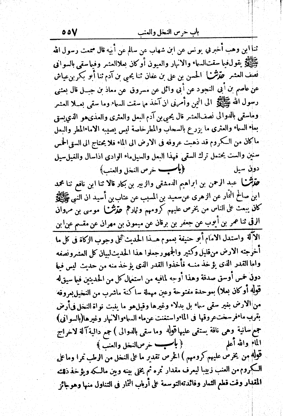 الْآلَةِ وَاسْتَدَلَّ الْإِمَامُ أَبُو حَنِيفَةَ بِعُمُومِ هَذَا الْحَدِيثِ عَلَى وُجُوبِ الزَّكَاةِ فِي كُلِّ مَا أَخْرَجَتْهُ الْأَرْضُ مِنْ قَلِيلٍ وَكَثِيرٍ وَالْجُمْهُورُ جَعَلُوا هَذَا الْحَدِيثَ لِبَيَانِ كُلِّ الْعُشْرِ وَنِصْفِهِ وَأَمَّا الْقَدْرُ الَّذِي يُؤْخَذُ مِنْهُ فَأَخَذُوا الْقَدْرَ الَّذِي يُؤْخَذُ مِنْهُ مِنْ حَدِيثِ «لَيْسَ فِيمَا دُونَ خَمْسِ أَوْسُقٍ صَدَقَةٌ» وَهَذَا أَوْجَهُ لِمَا فِيهِ مِنَ اسْتِعْمَالِ كُلٍّ مِنَ الْحَدِيثَيْنِ فِيمَا سِيقَ لَهُ.