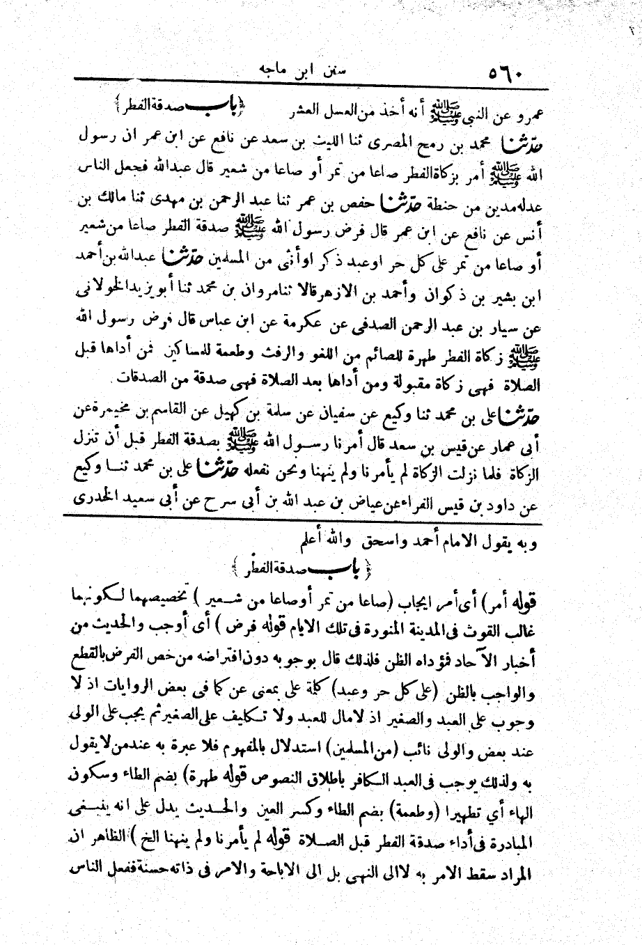 1825 - حَدَّثَنَا مُحَمَّدُ بْنُ رُمْحٍ الْمِصْرِيُّ أَنْبَأَنَا اللَّيْثُ بْنُ سَعْدٍ عَنْ نَافِعٍ عَنْ ابْنِ عُمَرَ «أَنَّ رَسُولَ اللَّهِ صَلَّى اللَّهُ عَلَيْهِ وَسَلَّمَ أَمَرَ بِزَكَاةِ الْفِطْرِ صَاعًا مِنْ تَمْرٍ أَوْ صَاعًا مِنْ شَعِيرٍ» قَالَ عَبْدُ اللَّهِ فَجَعَلَ النَّاسُ عِدْلَهُ مُدَّيْنِ مِنْ حِنْطَةٍ