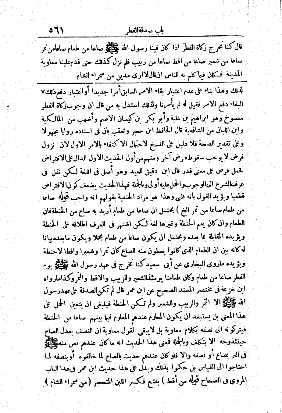 قَوْلُهُ (صَاعًا مِنْ طَعَامِ صَاعًا مِنْ تَمْرٍ إِلَخْ) يَحْتَمِلُ أَنَّ صَاعًا مِنْ طَعَامٍ أُرِيدَ بِهِ صَاعٌ مِنَ الْحِنْطَةِ فَإِنَّ الطَّعَامَ وَإِنْ كَانَ يَعُمُّ الْحِنْطَةَ وَغَيْرَهَا لُغَةً لَكِنِ اشْتُهِرَ فِي الْعُرْفِ إِطْلَاقُهُ عَلَى الْحِنْطَةِ وَيُؤَيِّدُهُ الْمُقَابَلَةُ بِمَا بَعْدَهُ وَيَحْتَمِلُ أَنْ يَكُونَ صَاعًا مِنْ طَعَامٍ مُجْمَلًا وَيَكُونَ مَا بَعْدَهُ بَيَانًا لَهُ كَأَنَّهُ بَيَّنَ أَنَّ الطَّعَامَ الَّذِي كَانُوا يُعْطُونَ مِنْهُ الصَّاعَ كَانَ تَمْرًا وَشَعِيرًا وَأَقِطًا لَا حِنْطَةً وَيُؤَيِّدُهُ مَا رَوَى الْبُخَارِيُّ «عَنْ أَبِي سَعِيدٍ كُنَّا نُخْرِجُ فِي عَهْدِ رَسُولِ اللَّهِ ـ صَلَّى اللَّهُ عَلَيْهِ وَسَلَّمَ ـ يَوْمَ الْفِطْرِ صَاعًا مِنْ طَعَامٍ وَكَانَ طَعَامُنَا يَوْمَئِذٍ الشَّعِيرُ وَالزَّبِيبُ وَالْأَقِطُ وَالتَّمْرُ» وَكَذَا مَا رَوَاهُ ابْنُ خُزَيْمَةَ فِي مُخْتَصَرِ الْمُسْنَدِ الصَّحِيحِ عَنِ ابْنِ عُمَرَ قَالَ «لَمْ تَكُنِ الصَّدَقَةُ عَلَى عَهْدِ رَسُولِ اللَّهِ ـ صَلَّى اللَّهُ عَلَيْهِ وَسَلَّمَ ـ إِلَّا التَّمْرَ وَالزَّبِيبَ وَالشَّعِيرَ وَلَمْ تَكُنِ الْحِنْطَةُ» فَيَنْبَغِي أَنْ يَتَعَيَّنَ الْحَمْلُ عَلَى هَذَا الْمَعْنَى بَلْ يُسْتَبْعَدُ أَنْ يَكُونَ الْمَعْلُومُ عِنْدَهُمُ الْمَعْلُومَ فِيمَا بَيْنَهُمْ صَاعًا مِنَ الْحِنْطَةِ فَيَتْرُكُونَهُ إِلَى نِصْفِهِ بِكَلَامِ مُعَاوِيَةَ بَلْ لَا يَبْقَى لِقَوْلِ مُعَاوِيَةَ إِنَّ النِّصْفَ يَعْدِلُ الصَّاعَ حِينَئِذٍ وَجْهٌ إِلَّا بِتَكَلُّفٍ وَبِالْجُمْلَةِ فَمَعْنَى هَذَا الْحَدِيثِ أَنَّهُ مَا كَانَ عِنْدَهُمْ نَصٌّ مِنْهُ ـ صَلَّى اللَّهُ عَلَيْهِ وَسَلَّمَ ـ فِي الْبُرِّ بِصَاعٍ أَوْ نِصْفِهِ وَإِلَّا فَلَوْ كَانَ عِنْدَهُمْ حَدِيثٌ بِالصَّاعِ لَمَا خَالَفُوهُ أَوْ بِنِصْفِهِ لَمَا احْتَاجُوا إِلَى الْقِيَاسِ بَلْ حَكَمُوا بِذَلِكَ وَيَدُلُّ عَلَى هَذَا حَدِيثُ ابْنِ عُمَرَ فِي هَذَا الْبَابِ الْمَرْوِيُّ فِي الصِّحَاحِ قَوْلُهُ (مِنْ أَقِطٍ) بِفَتْحٍ فَكَسْرٍ اللَّبَنُ الْمُتَحَجِّرُ (مِنْ سَمْرَاءَ الشَّامِ)