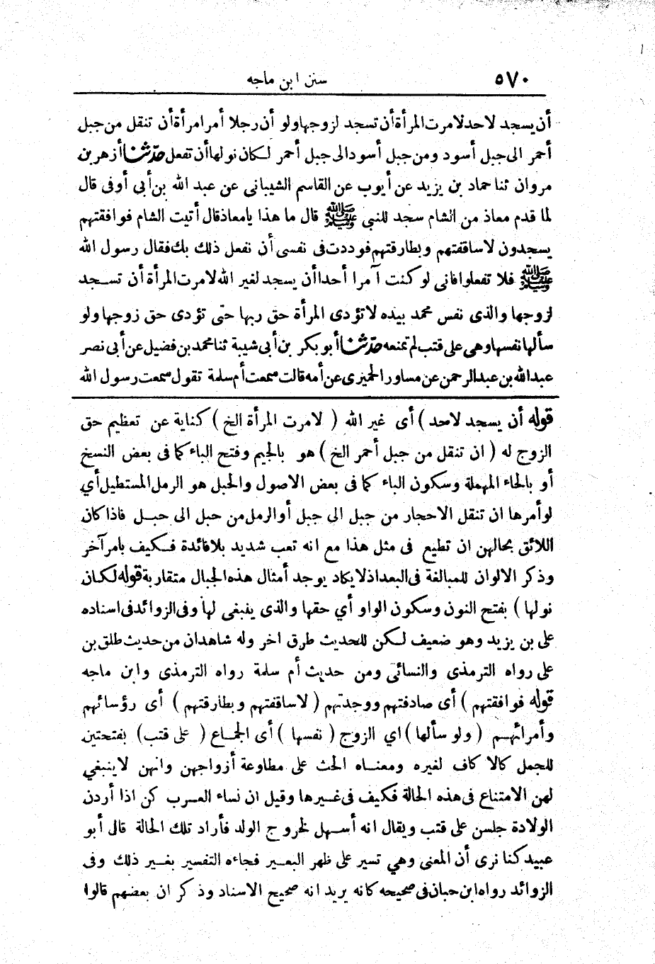 1853 - حَدَّثَنَا أَزْهَرُ بْنُ مَرْوَانَ قَالَ حَدَّثَنَا حَمَّادُ بْنُ زَيْدٍ عَنْ أَيُّوبَ عَنْ الْقَاسِمِ الشَّيْبَانِيِّ عَنْ عَبْدِ اللَّهِ بْنِ أَبِي أَوْفَى قَالَ «لَمَّا قَدِمَ مُعَاذٌ مِنْ الشَّامِ سَجَدَ لِلنَّبِيِّ صَلَّى اللَّهُ عَلَيْهِ وَسَلَّمَ قَالَ مَا هَذَا يَا مُعَاذُ قَالَ أَتَيْتُ الشَّامَ فَوَافَقْتُهُمْ يَسْجُدُونَ لِأَسَاقِفَتِهِمْ وَبَطَارِقَتِهِمْ فَوَدِدْتُ فِي نَفْسِي أَنْ نَفْعَلَ ذَلِكَ بِكَ فَقَالَ رَسُولُ اللَّهِ صَلَّى اللَّهُ عَلَيْهِ وَسَلَّمَ فَلَا تَفْعَلُوا فَإِنِّي لَوْ كُنْتُ آمِرًا أَحَدًا أَنْ يَسْجُدَ لِغَيْرِ اللَّهِ لَأَمَرْتُ الْمَرْأَةَ أَنْ تَسْجُدَ لِزَوْجِهَا وَالَّذِي نَفْسُ مُحَمَّدٍ بِيَدِهِ لَا تُؤَدِّي الْمَرْأَةُ حَقَّ رَبِّهَا حَتَّى تُؤَدِّيَ حَقَّ زَوْجِهَا وَلَوْ سَأَلَهَا نَفْسَهَا وَهِيَ عَلَى قَتَبٍ لَمْ تَمْنَعْهُ»