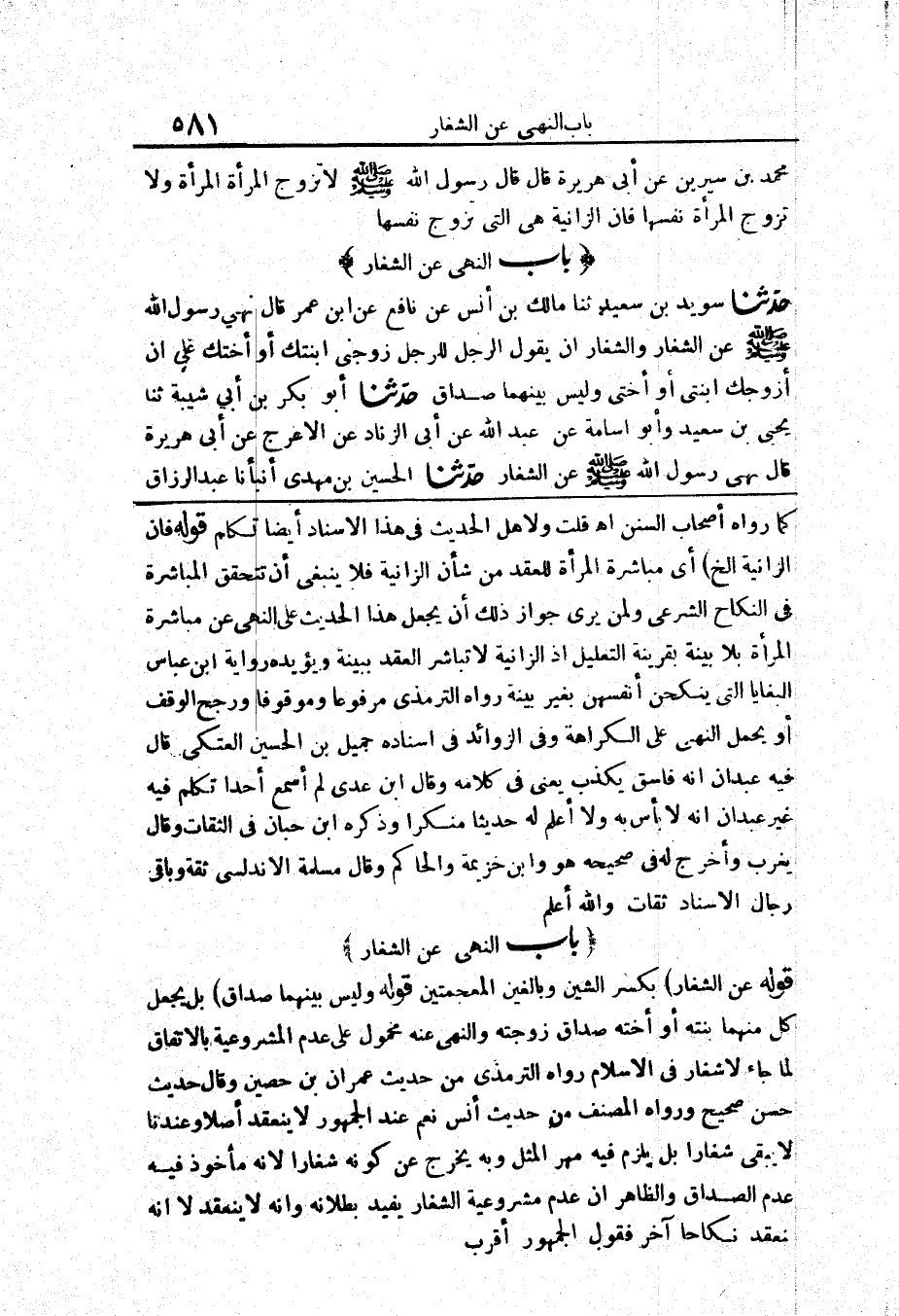 قَوْلُهُ: (عَنِ الشِّغَارِ) بِكَسْرِ الشِّينِ وَبِالْغَيْنِ الْمُعْجَمَتَيْنِ قَوْلُهُ: (وَلَيْسَ بَيْنَهُمَا صَدَاقٌ) بَلْ يَجْعَلُ كُلٌّ مِنْهُمَا بِنْتَهُ أَوْ أُخْتَهُ صَدَاقَ زَوْجَتِهِ وَالنَّهْيُ عَنْهُ مَحْمُولٌ عَلَى عَدَمِ الْمَشْرُوعِيَّةِ بِالِاتِّفَاقِ لِمَا جَاءَ «لَا شِغَارَ فِي الْإِسْلَامِ» رَوَاهُ التِّرْمِذِيُّ مِنْ حَدِيثِ عِمْرَانَ بْنِ حُصَيْنٍ وَقَالَ حَدِيثٌ حَسَنٌ صَحِيحٌ وَرَوَاهُ الْمُصَنِّفُ مِنْ حَدِيثِ أَنَسٍ نَعَمْ عِنْدَ الْجُمْهُورِ لَا يَنْعَقِدُ أَصْلًا وَعِنْدَنَا لَا يَبْقَى شِغَارًا بَلْ يَلْزَمُ فِيهِ مَهْرُ الْمِثْلِ وَبِهِ يَخْرُجُ عَنْ كَوْنِهِ شِغَارًا لِأَنَّهُ مَأْخُوذٌ فِيهِ عَدَمُ الصَّدَاقِ وَالظَّاهِرُ أَنَّ عَدَمَ مَشْرُوعِيَّةِ الشِّغَارِ يُفِيدُ بُطْلَانَهُ وَأَنَّهُ لَا يَنْعَقِدُ لَا أَنَّهُ انْعَقَدَ نِكَاحًا آخَرَ فَقَوْلُ الْجُمْهُورِ أَقْرَبُ.