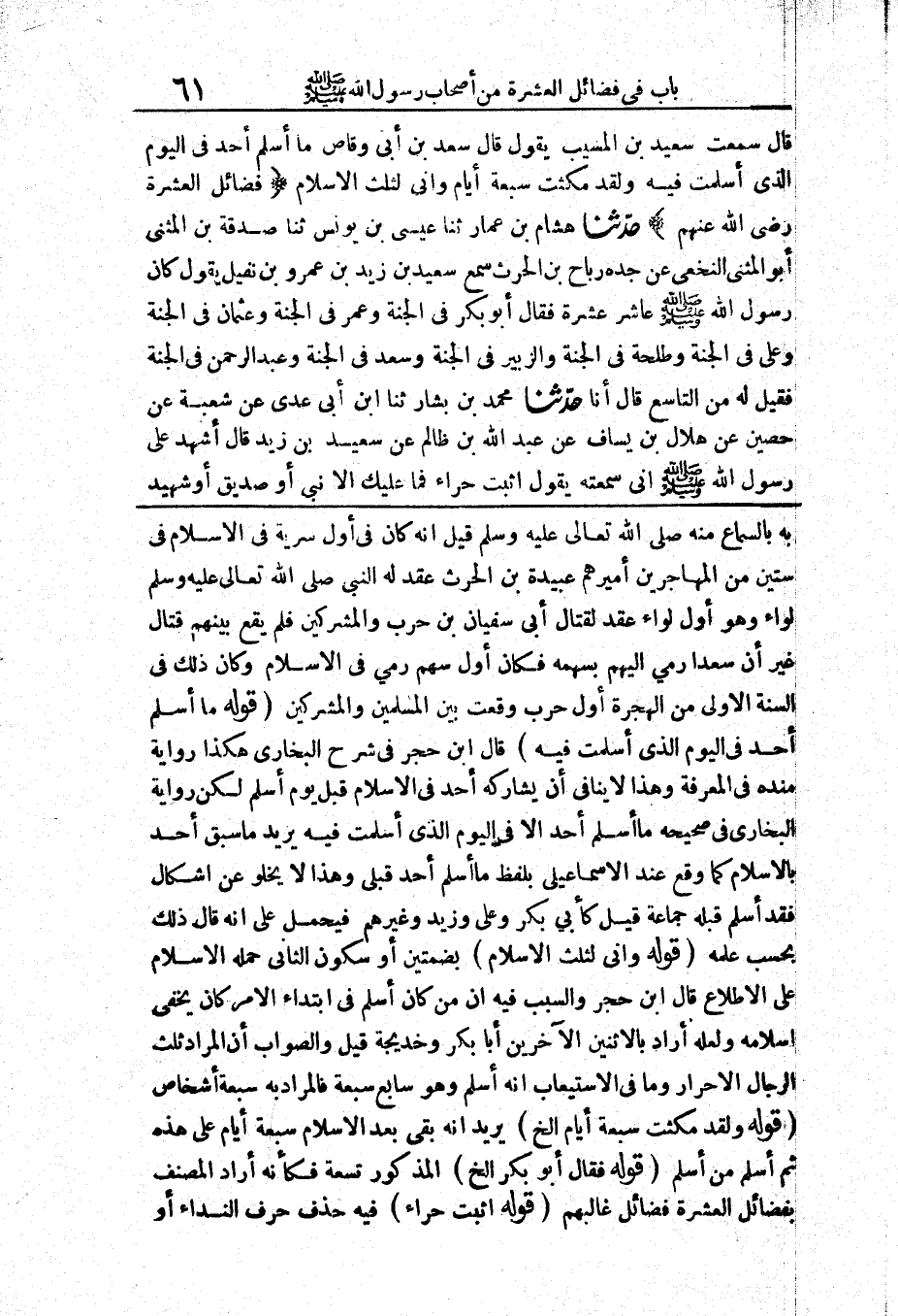 133 - حَدَّثَنَا هِشَامُ بْنُ عَمَّارٍ حَدَّثَنَا عِيسَى بْنُ يُونُسَ حَدَّثَنَا صَدَقَةُ بْنُ الْمُثَنَّى أَبُو الْمُثَنَّى النَّخَعِيُّ عَنْ جَدِّهِ رِيَاحِ بْنِ الْحَارِثِ سَمِعَ سَعِيدَ بْنَ زَيْدِ بْنِ عَمْرِو بْنِ نُفَيْلٍ يَقُولُ «كَانَ رَسُولُ اللَّهِ صَلَّى اللَّهُ عَلَيْهِ وَسَلَّمَ عَاشِرَ عَشَرَةٍ فَقَالَ أَبُو بَكْرٍ فِي الْجَنَّةِ وَعُمَرُ فِي الْجَنَّةِ وَعُثْمَانُ فِي الْجَنَّةِ وَعَلِيٌّ فِي الْجَنَّةِ وَطَلْحَةُ فِي الْجَنَّةِ وَالزُّبَيْرُ فِي الْجَنَّةِ وَسَعْدٌ فِي الْجَنَّةِ وَعَبْدُ الرَّحْمَنِ فِي الْجَنَّةِ فَقِيلَ لَهُ مَنْ التَّاسِعُ قَالَ أَنَا»