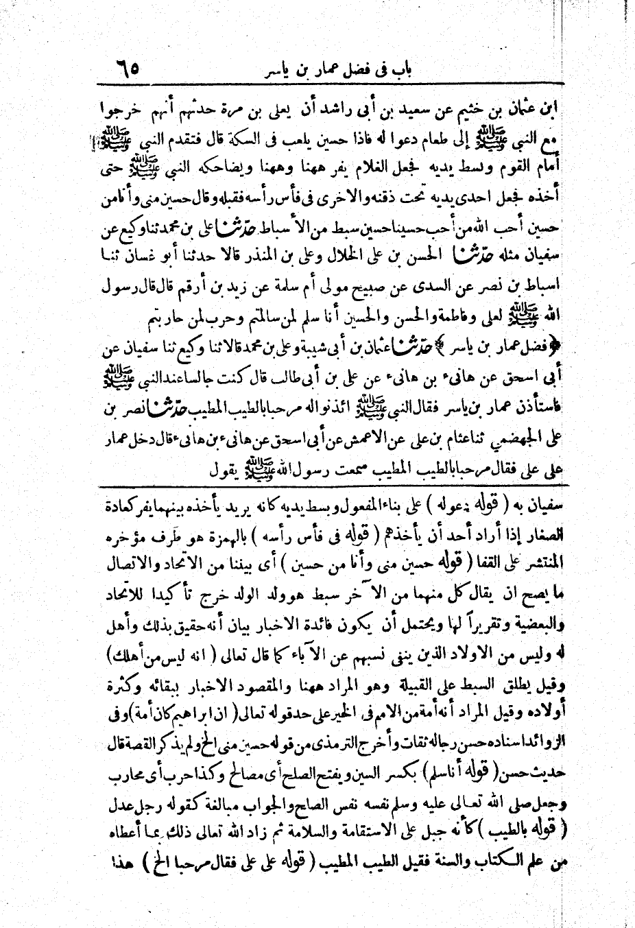 147 - حَدَّثَنَا نَصْرُ بْنُ عَلِيٍّ الْجَهْضَمِيُّ حَدَّثَنَا عَثَّامُ بْنُ عَلِيٍّ عَنْ الْأَعْمَشِ عَنْ أَبِي إِسْحَقَ عَنْ هَانِئِ بْنِ هَانِيءٍ قَالَ «دَخَلَ عَمَّارٌ عَلَى عَلِيٍّ فَقَالَ مَرْحَبًا بِالطَّيِّبِ الْمُطَيَّبِ سَمِعْتُ رَسُولَ اللَّهِ صَلَّى اللَّهُ عَلَيْهِ وَسَلَّمَ يَقُولُ مُلِئَ عَمَّارٌ إِيمَانًا إِلَى مُشَاشِهِ»