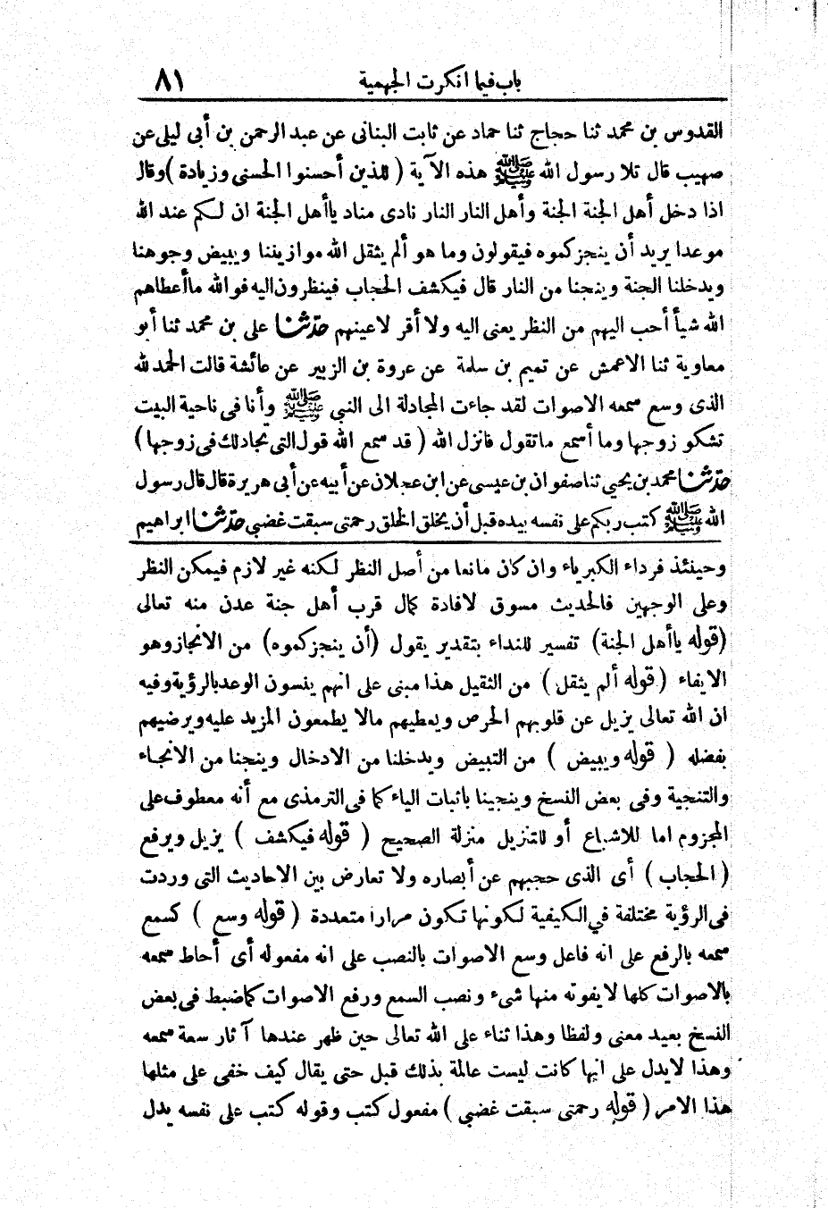 187 - حَدَّثَنَا عَبْدُ الْقُدُّوسِ بْنُ مُحَمَّدٍ حَدَّثَنَا حَجَّاجٌ حَدَّثَنَا حَمَّادٌ عَنْ ثَابِتٍ الْبُنَانِيِّ عَنْ عَبْدِ الرَّحْمَنِ بْنِ أَبِي لَيْلَى عَنْ صُهَيْبٍ قَالَ «تَلَا رَسُولُ اللَّهِ صَلَّى اللَّهُ عَلَيْهِ وَسَلَّمَ هَذِهِ الْآيَةَ {لِلَّذِينَ أَحْسَنُوا الْحُسْنَى وَزِيَادَةٌ} [يونس: 26] وَقَالَ إِذَا دَخَلَ أَهْلُ الْجَنَّةِ الْجَنَّةَ وَأَهْلُ النَّارِ النَّارَ نَادَى مُنَادٍ يَا أَهْلَ الْجَنَّةِ إِنَّ لَكُمْ عِنْدَ اللَّهِ مَوْعِدًا يُرِيدُ أَنْ يُنْجِزَكُمُوهُ فَيَقُولُونَ وَمَا هُوَ أَلَمْ يُثَقِّلْ اللَّهُ مَوَازِينَنَا وَيُبَيِّضْ وُجُوهَنَا وَيُدْخِلْنَا الْجَنَّةَ وَيُنْجِنَا مِنْ النَّارِ قَالَ فَيَكْشِفُ الْحِجَابَ فَيَنْظُرُونَ إِلَيْهِ فَوَاللَّهِ مَا أَعَطَاهُمْ اللَّهُ شَيْئًا أَحَبَّ إِلَيْهِمْ مِنْ النَّظَرِ يَعْنِي إِلَيْهِ وَلَا أَقَرَّ لِأَعْيُنِهِمْ»