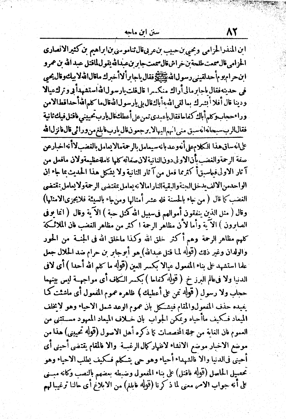 190 - حَدَّثَنَا إِبْرَاهِيمُ بْنُ الْمُنْذِرِ الْحِزَامِيُّ وَيَحْيَى بْنُ حَبِيبِ بْنِ عَرَبِيٍّ قَالَا حَدَّثَنَا مُوسَى بْنُ إِبْرَاهِيمَ بْنِ كَثِيرٍ الْأَنْصَارِيُّ الْحَرَامِيُّ قَالَ سَمِعْتُ طَلْحَةَ بْنَ خِرَاشٍ قَالَ سَمِعْتُ جَابِرَ بْنَ عَبْدِ اللَّهِ يَقُولُ «لَمَّا قُتِلَ عَبْدُ اللَّهِ بْنُ عَمْرِو بْنِ حَرَامٍ يَوْمَ أُحُدٍ لَقِيَنِي رَسُولُ اللَّهِ صَلَّى اللَّهُ عَلَيْهِ وَسَلَّمَ فَقَالَ يَا جَابِرُ أَلَا أُخْبِرُكَ مَا قَالَ اللَّهُ لِأَبِيكَ وَقَالَ يَحْيَى فِي حَدِيثِهِ فَقَالَ يَا جَابِرُ مَا لِي أَرَاكَ مُنْكَسِرًا قُلْتُ يَا رَسُولَ اللَّهِ اسْتُشْهِدَ أَبِي وَتَرَكَ عِيَالًا وَدَيْنًا قَالَ أَفَلَا أُبَشِّرُكَ بِمَا لَقِيَ اللَّهُ بِهِ أَبَاكَ قَالَ بَلَى يَا رَسُولَ اللَّهِ قَالَ مَا كَلَّمَ اللَّهُ أَحَدًا قَطُّ إِلَّا مِنْ وَرَاءِ حِجَابٍ وَكَلَّمَ أَبَاكَ كِفَاحًا فَقَالَ يَا عَبْدِي تَمَنَّ عَلَيَّ أُعْطِكَ قَالَ يَا رَبِّ تُحْيِينِي فَأُقْتَلُ فِيكَ ثَانِيَةً فَقَالَ الرَّبُّ سُبْحَانَهُ إِنَّهُ سَبَقَ مِنِّي أَنَّهُمْ إِلَيْهَا لَا يَرْجِعُونَ قَالَ يَا رَبِّ فَأَبْلِغْ مَنْ وَرَائِي قَالَ فَأَنْزَلَ اللَّهُ تَعَالَى {وَلَا تَحْسَبَنَّ الَّذِينَ قُتِلُوا فِي سَبِيلِ اللَّهِ أَمْوَاتًا بَلْ أَحْيَاءٌ عِنْدَ رَبِّهِمْ يُرْزَقُونَ} [آل عمران: 169] »
