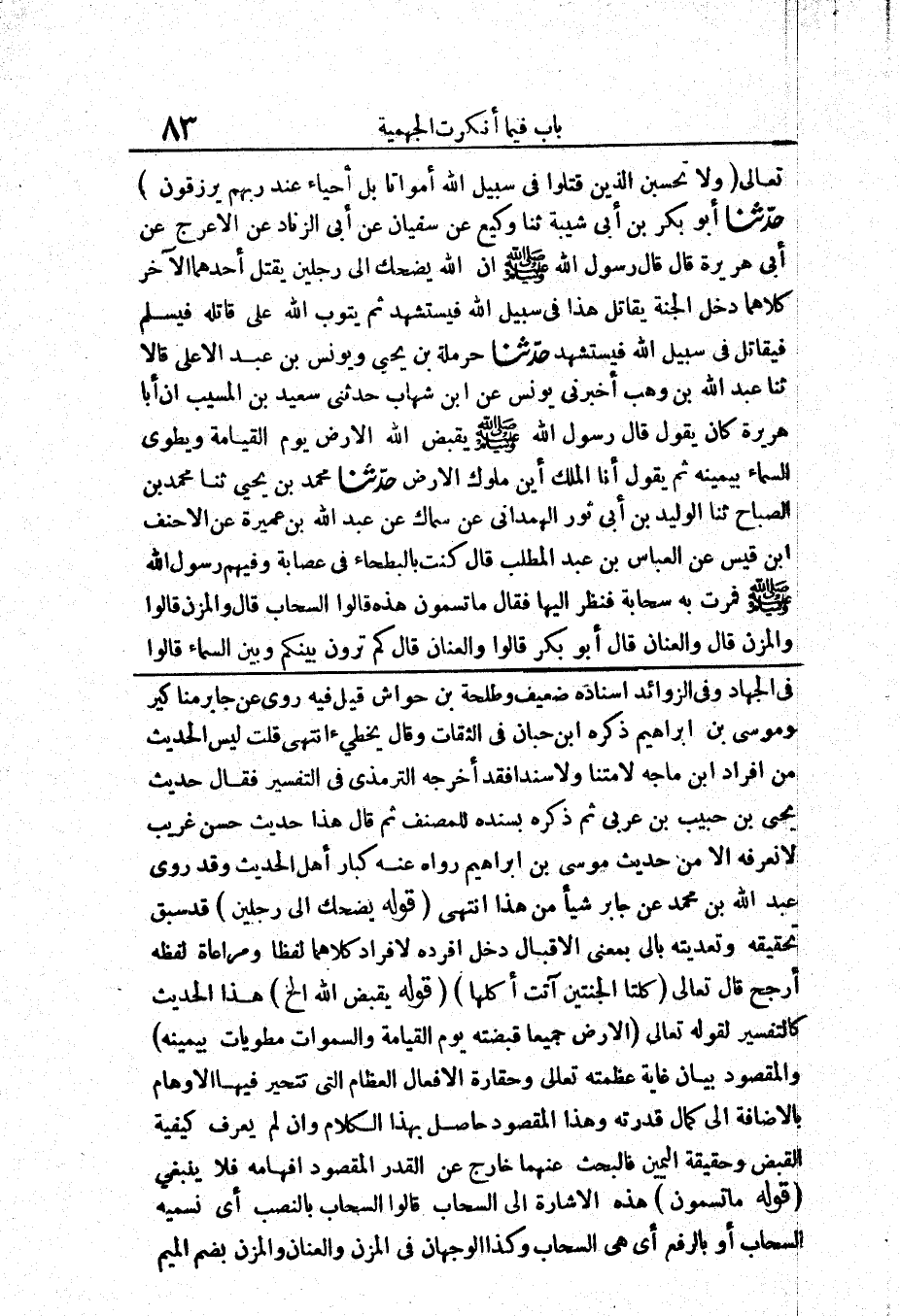 193 - حَدَّثَنَا مُحَمَّدُ بْنُ يَحْيَى حَدَّثَنَا مُحَمَّدُ بْنُ الصَّبَّاحِ حَدَّثَنَا الْوَلِيدُ بْنُ أَبِي ثَوْرٍ الْهَمْدَانِيُّ عَنْ سِمَاكٍ عَنْ عَبْدِ اللَّهِ بْنِ عَمِيرَةَ عَنْ الْأَحْنَفِ بْنِ قَيْسٍ عَنْ الْعَبَّاسِ بْنِ عَبْدِ الْمُطَّلِبِ قَالَ «كُنْتُ بِالْبَطْحَاءِ فِي عِصَابَةٍ وَفِيهِمْ رَسُولُ اللَّهِ صَلَّى اللَّهُ عَلَيْهِ وَسَلَّمَ فَمَرَّتْ بِهِ سَحَابَةٌ فَنَظَرَ إِلَيْهَا فَقَالَ مَا تُسَمُّونَ هَذِهِ قَالُوا السَّحَابُ قَالَ وَالْمُزْنُ قَالُوا وَالْمُزْنُ قَالَ وَالْعَنَانُ قَالَ أَبُو بَكْرٍ قَالُوا وَالْعَنَانُ قَالَ كَمْ تَرَوْنَ بَيْنَكُمْ وَبَيْنَ السَّمَاءِ قَالُوا لَا نَدْرِي قَالَ فَإِنَّ بَيْنَكُمْ وَبَيْنَهَا إِمَّا وَاحِدًا أَوْ اثْنَيْنِ أَوْ ثَلَاثًا وَسَبْعِينَ سَنَةً وَالسَّمَاءُ فَوْقَهَا كَذَلِكَ حَتَّى عَدَّ سَبْعَ سَمَاوَاتٍ ثُمَّ فَوْقَ السَّمَاءِ السَّابِعَةِ بَحْرٌ بَيْنَ أَعْلَاهُ وَأَسْفَلِهِ كَمَا بَيْنَ سَمَاءٍ إِلَى سَمَاءٍ ثُمَّ فَوْقَ ذَلِكَ ثَمَانِيَةُ أَوْعَالٍ بَيْنَ أَظْلَافِهِنَّ وَرُكَبِهِنَّ كَمَا بَيْنَ سَمَاءٍ إِلَى سَمَاءٍ ثُمَّ عَلَى ظُهُورِهِنَّ الْعَرْشُ بَيْنَ أَعْلَاهُ وَأَسْفَلِهِ كَمَا بَيْنَ سَمَاءٍ إِلَى سَمَاءٍ ثُمَّ اللَّهُ فَوْقَ ذَلِكَ تَبَارَكَ وَتَعَالَى»