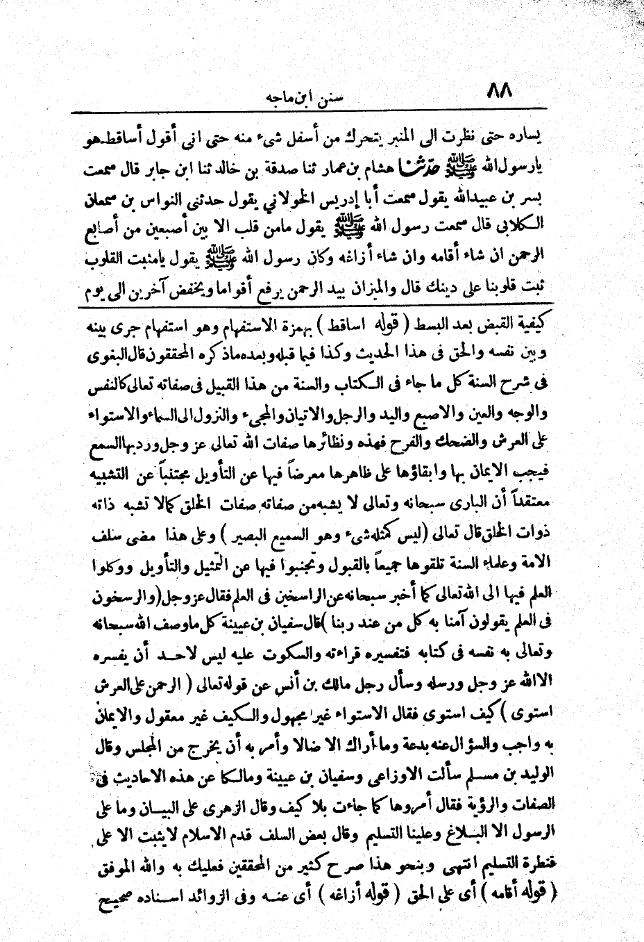 199 - حَدَّثَنَا هِشَامُ بْنُ عَمَّارٍ حَدَّثَنَا صَدَقَةُ بْنُ خَالِدٍ حَدَّثَنَا ابْنُ جَابِرٍ قَالَ سَمِعْتُ بُسْرَ بْنَ عُبَيْدِ اللَّهِ يَقُولُ سَمِعْتُ أَبَا إِدْرِيسَ الْخَوْلَانِيَّ يَقُولُ حَدَّثَنِي النَّوَّاسُ بْنُ سَمْعَانَ الْكِلَابِيُّ قَالَ «سَمِعْتُ رَسُولَ اللَّهِ صَلَّى اللَّهُ عَلَيْهِ وَسَلَّمَ يَقُولُ مَا مِنْ قَلْبٍ إِلَّا بَيْنَ إِصْبَعَيْنِ مِنْ أَصَابِعِ الرَّحْمَنِ إِنْ شَاءَ أَقَامَهُ وَإِنْ شَاءَ أَزَاغَهُ وَكَانَ رَسُولُ اللَّهِ صَلَّى اللَّهُ عَلَيْهِ وَسَلَّمَ يَقُولُ يَا مُثَبِّتَ الْقُلُوبِ ثَبِّتْ قُلُوبَنَا عَلَى دِينِكَ قَالَ وَالْمِيزَانُ بِيَدِ الرَّحْمَنِ يَرْفَعُ أَقْوَامًا وَيَخْفِضُ آخَرِينَ إِلَى يَوْمِ الْقِيَامَةِ»