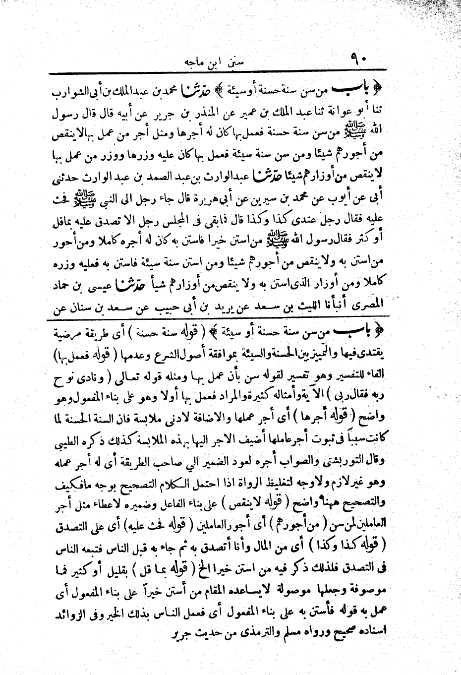 203 - حَدَّثَنَا مُحَمَّدُ بْنُ عَبْدِ الْمَلِكِ بْنِ أَبِي الشَّوَارِبِ حَدَّثَنَا أَبُو عَوَانَةَ حَدَّثَنَا عَبْدُ الْمَلِكِ بْنُ عُمَيْرٍ عَنْ الْمُنْذِرِ بْنِ جَرِيرٍ عَنْ أَبِيهِ قَالَ «قَالَ رَسُولُ اللَّهِ صَلَّى اللَّهُ عَلَيْهِ وَسَلَّمَ مَنْ سَنَّ سُنَّةً حَسَنَةً فَعُمِلَ بِهَا كَانَ لَهُ أَجْرُهَا وَمِثْلُ أَجْرِ مَنْ عَمِلَ بِهَا لَا يَنْقُصُ مِنْ أُجُورِهِمْ شَيْئًا وَمَنْ سَنَّ سُنَّةً سَيِّئَةً فَعُمِلَ بِهَا كَانَ عَلَيْهِ وِزْرُهَا وَوِزْرُ مَنْ عَمِلَ بِهَا مِنْ بَعْدِهِ لَا يَنْقُصُ مِنْ أَوْزَارِهِمْ شَيْئًا»