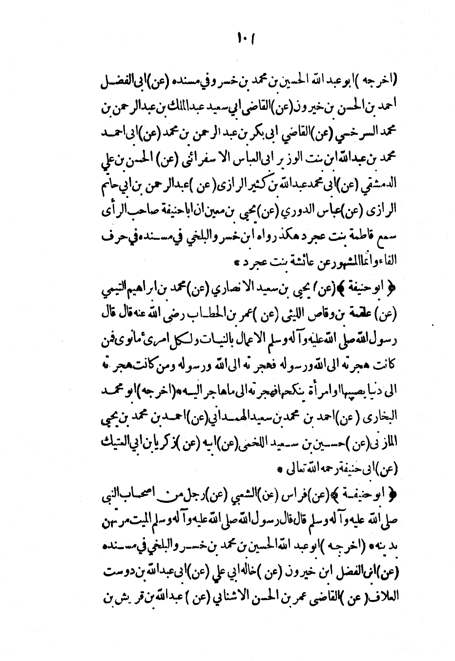 (أبو حنيفة) (عن) يحيى بن سعيد الأنصاري (عن) محمد بن إبراهيم التيمي (عن) علقمة بن وقاص الليثي (عن) عمر بن الخطاب رضي الله عنه قال قال رسول الله صلى الله عليه وآله وسلم الأعمال بالنيات ولكل امرئ ما نوى فمن كانت هجرته إلى الله ورسوله فهجرته إلى الله ورسوله ومن كانت هجرته إلى دنيا يصيبها أو امرأة ينكحها فهجرته إلى ما هاجر إليه* (أخرجه) أبو محمد البخاري (عن) أحمد بن محمد بن سعيد الهمداني (عن) أحمد بن محمد بن يحيى المازني (عن) حسين بن سعيد اللخمي (عن) أبيه (عن) زكريا بن أبي العتيك (عن) أبي حنيفة رحمه الله تعالى*