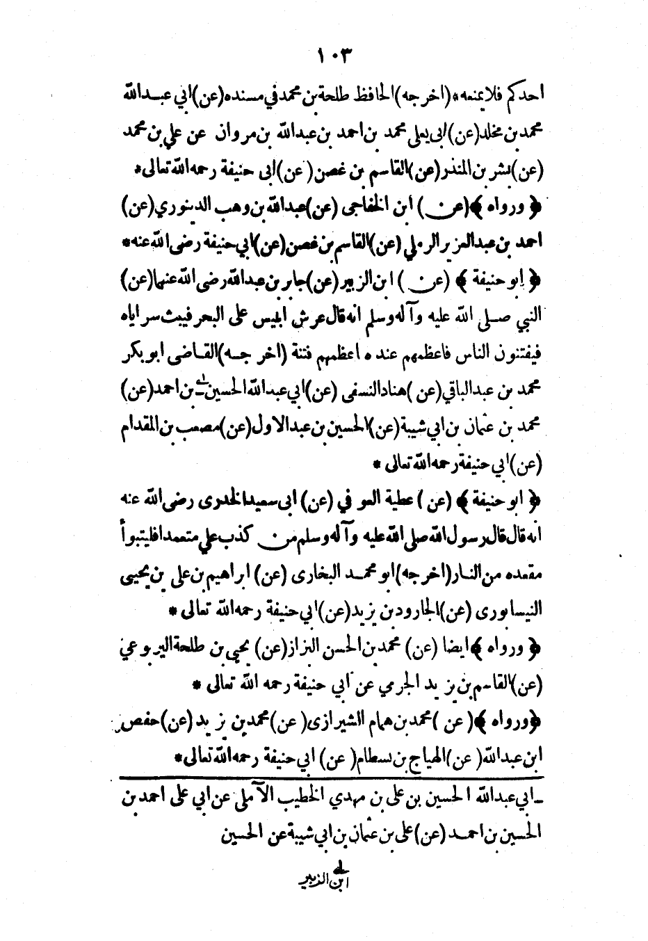 (أبو حنيفة) (عن) عطية العوفي (عن) أبي سعيد الخدري رضي الله عنه أنه قال قال رسول الله صلى الله عليه وآله وسلم من كذب علي متعمداً فليتبوأ مقعده من النار (أخرجه) أبو محمد البخاري (عن) إبراهيم بن علي بن يحيى النيسابوري (عن) الجارود بن يزيد (عن) أبي حنيفة رحمه الله تعالى*