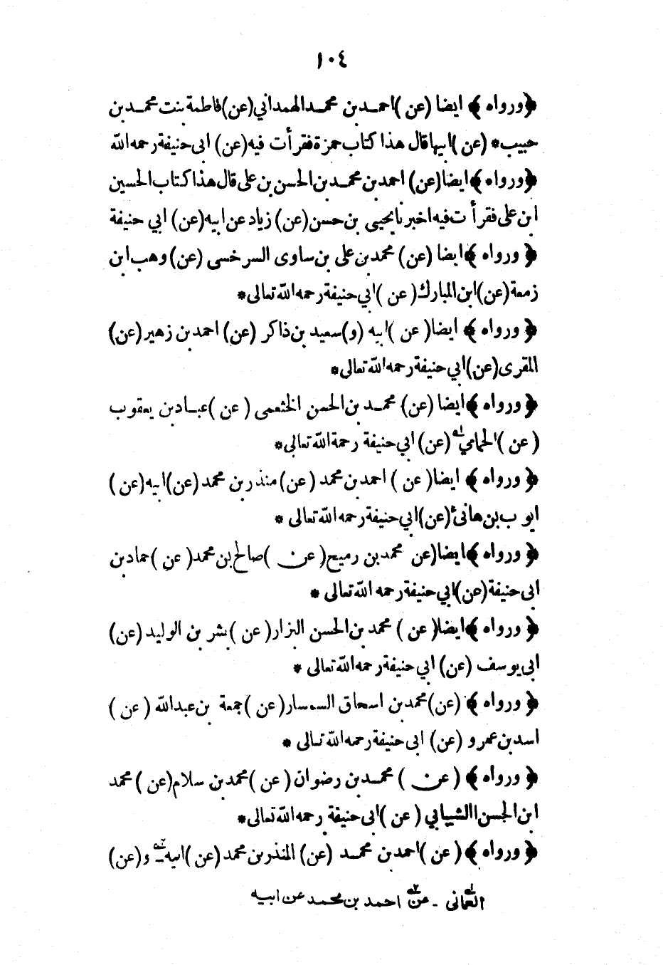 (ورواه) أيضاً (عن) أحمد بن محمد الهمداني (عن) فاطمة بنت محمد بن حبيب* (عن) أبيها قال هذا كتاب حمزة فقرأت فيه (عن) أبي حنيفة رحمه الله*