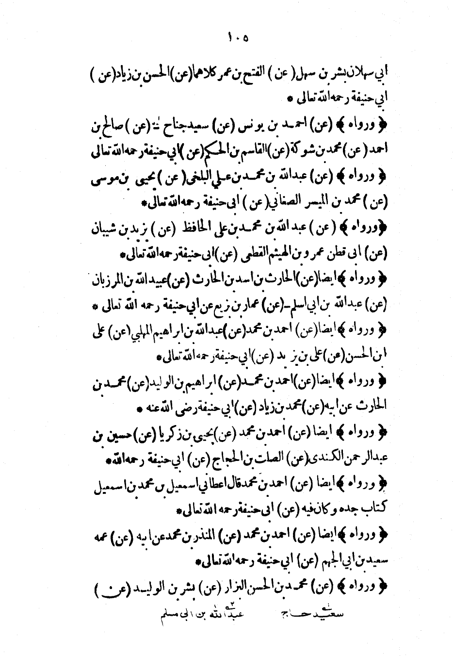 (ورواه) أيضاً (عن) أحمد بن محمد (عن) يحيى بن زكريا (عن) حسين بن عبد الرحمن الكندي (عن) الصلت بن الحجاج (عن) أبي حنيفة رحمه الله*