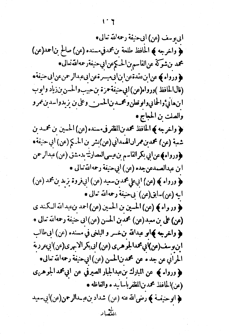(وأخرجه) الحافظ محمد بن المظفر في مسنده (عن) الحسين بن محمد بن شعبة (عن) محمد بن عمران الهمداني (عن) بشر بن الحكم (عن) أبي حنيفة*