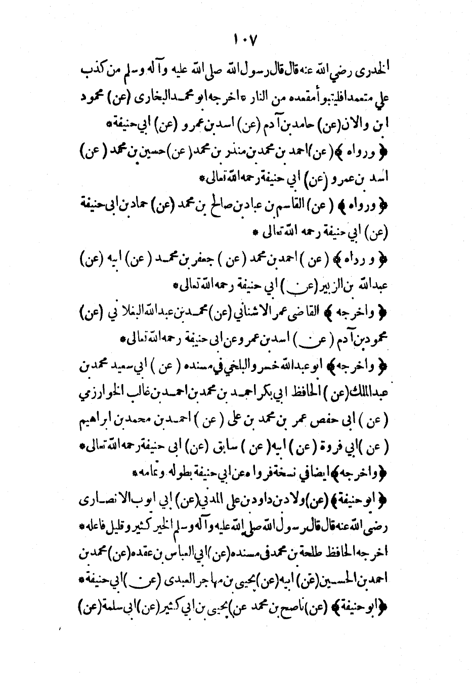 الخدري رضي الله عنه قال قال رسول الله صلى الله عليه وآله وسلم من كذب علي متعمداً فليتبوأ مقعده من النار* أخرجه أبو محمد البخاري (عن) محمود ابن والان (عن) حامد بن آدم (عن) أسد بن عمرو (عن) أبي حنيفة*