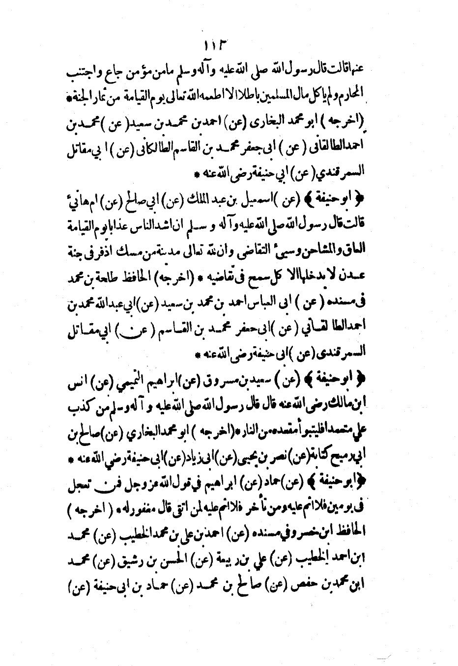 (أبو حنيفة) (عن) سعيد بن مسروق (عن) إبراهيم التميمي (عن) أنس ابن مالك رضي الله عنه قال قال رسول الله صلى الله عليه وآله وسلم من كذب علي متعمداً فليتبوأ مقعده من النار* (أخرجه) أبو محمد البخاري (عن) صالح بن أبي رميح كتابة (عن) نصر بن يحيى (عن) أبي زياد (عن) أبي حنيفة رضي الله عنه*