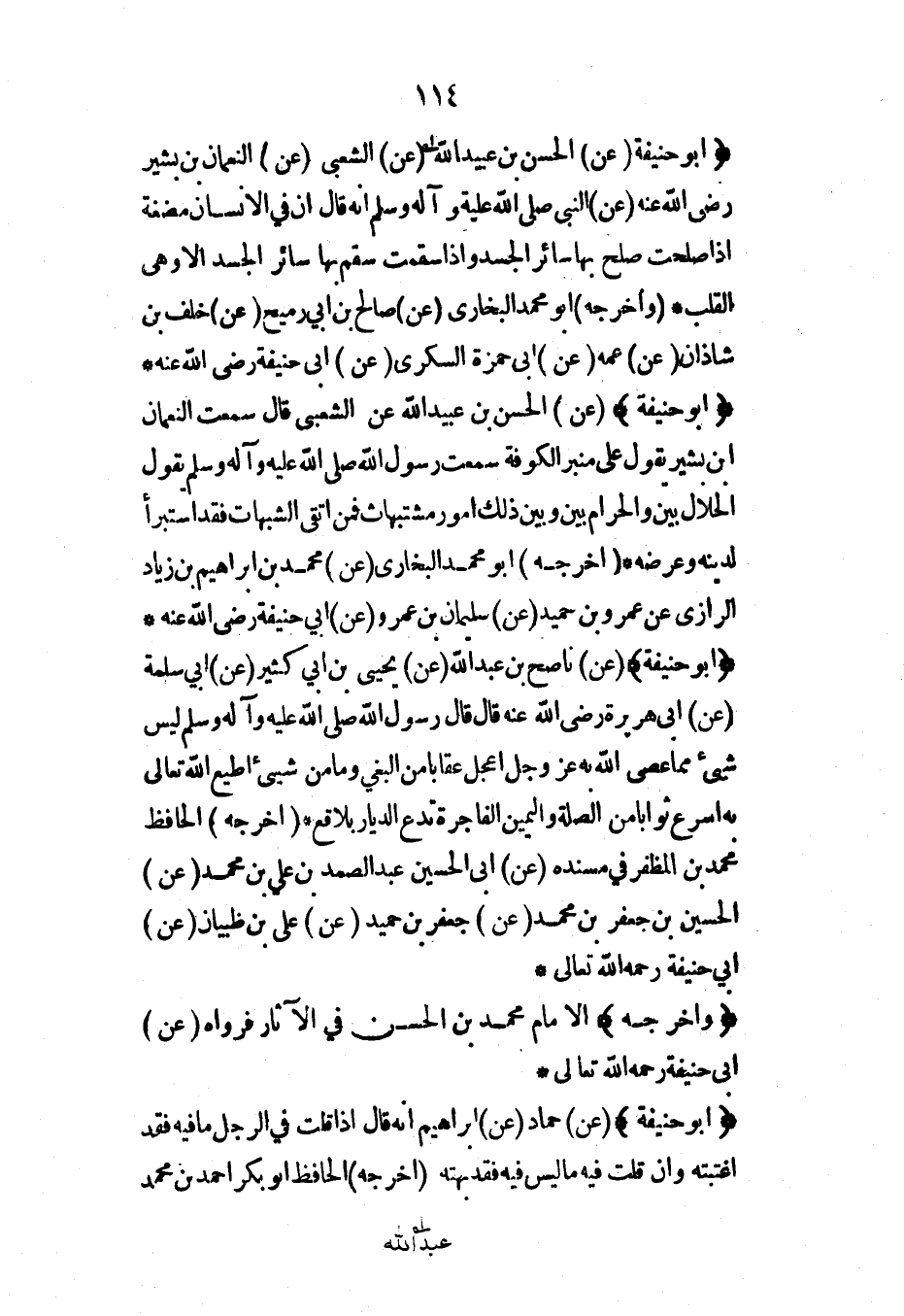 (أبو حنيفة) (عن) الحسن بن عبيد الله عن الشعبي قال سمعت النعمان ابن بشير يقول على منبر الكوفة سمعت رسول الله صلى الله عليه وآله وسلم يقول الحلال بين والحرام بين وبين ذلك أمور مشتبهات فمن اتقى الشبهات فقد استبرأ لدينه وعرضه* (أخرجه) أبو محمد البخاري (عن) محمد بن إبراهيم بن زياد الرازي عن عمرو بن حميد (عن) سليمان بن عمرو (عن) أبي حنيفة رضي الله عنه*