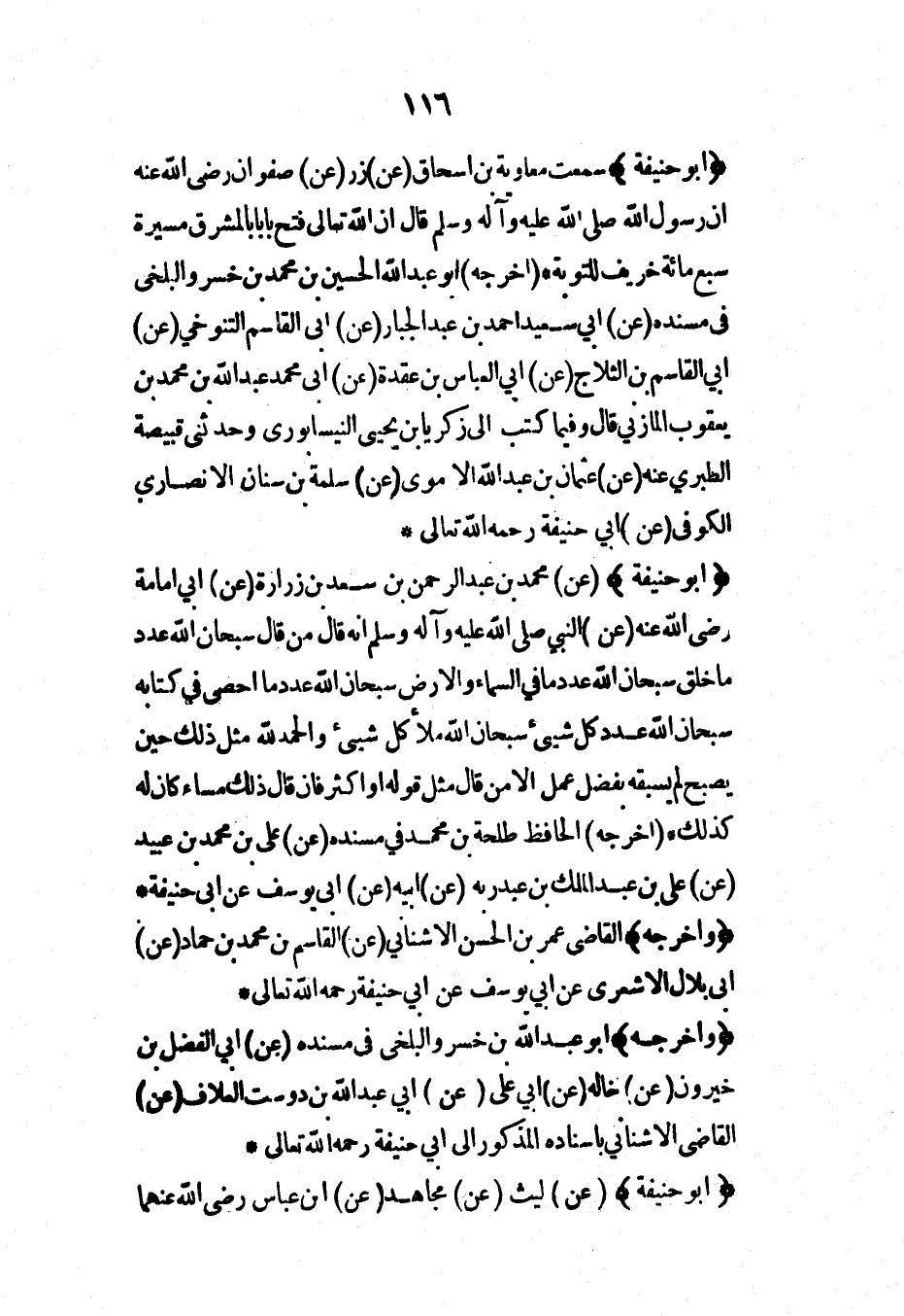 (أبو حنيفة) (عن) محمد بن عبد الرحمن بن سعد بن زرارة (عن) أبي أمامة رضي الله عنه (عن) النبي صلى الله عليه وآله وسلم أنه قال من قال سبحان الله عدد ما خلق سبحان الله عدد ما في السماء والأرض سبحان الله عدد ما أحصى في كتابه سبحان الله عدد كل شيء سبحان الله ملأ كل شيء والحمد لله مثل ذلك حين يصبح لم يسبقه بفضل عمل إلا من قال مثل قوله أو أكثر فإن قال ذلك مساء كان له كذلك (أخرجه) الحافظ طلحة بن محمد في مسنده (عن) علي بن محمد بن عبيد (عن) علي بن عبد الملك بن عبد ربه (عن) أبيه (عن) أبي يوسف عن أبي حنيفة*