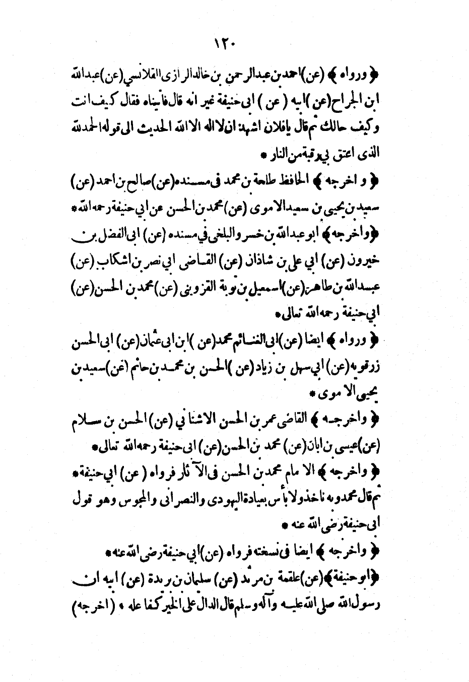 (وأخرجه) القاضي عمر بن الحسن الأشناني (عن) الحسن بن سلام (عن) عيسى بن أبان (عن) محمد بن الحسن (عن) أبي حنيفة رحمه الله تعالى*