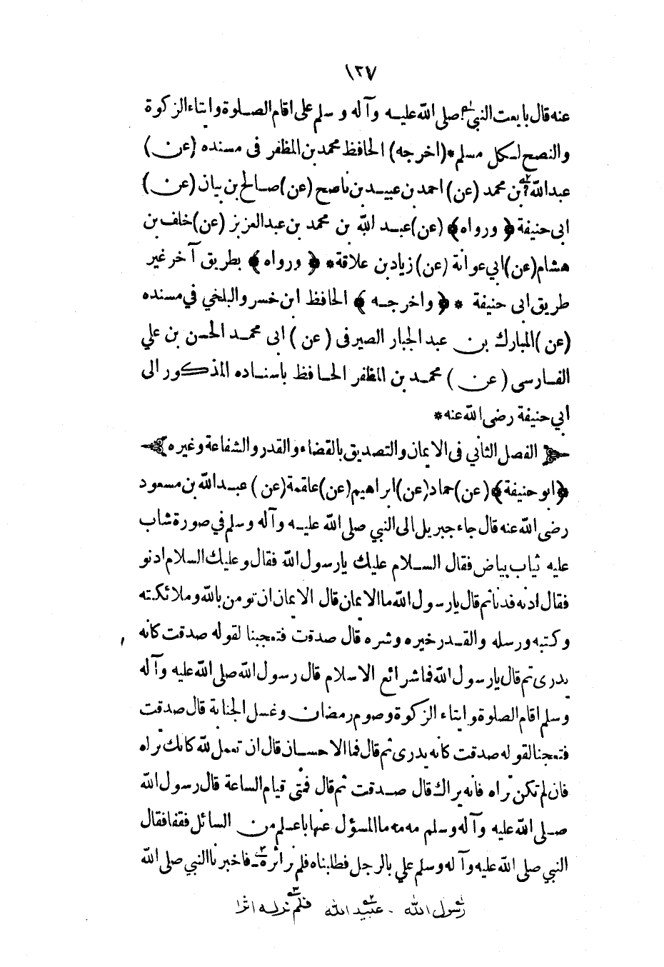 (أبو حنيفة) (عن) حماد (عن) إبراهيم (عن) علقمة (عن) عبد الله بن مسعود رضي الله عنه قال جاء جبريل إلى النبي صلى الله عليه وآله وسلم في صورة شاب عليه ثياب بياض فقال السلام عليك يا رسول الله فقال وعليك السلام ادنو فقال ادنه فدنا ثم قال يا رسول الله ما الإيمان قال الإيمان أن تؤمن بالله وملائكته وكتبه ورسله والقدر خيره وشره قال صدقت فتعجبنا لقوله صدقت كأنه يدري ثم قال يا رسول الله فما شرائع الإسلام قال رسول الله صلى الله عليه وآله وسلم إقام الصلاة وإيتاء الزكوة وصوم رمضان وغسل الجنابة قال صدقت فتعجبنا لقوله صدقت كأنه يدري ثم قال فما الإحسان قال أن تعمل لله كأنك تراه فإن لم تكن تراه فإنه يراك قال صدقت ثم قال فمتى قيام الساعة قال رسول الله صلى الله عليه وآله وسلم مه مه ما المسؤل عنها بأعلم من السائل فقفا فقال النبي صلى الله عليه وآله وسلم علي بالرجل فطلبناه فلم نر أثره فأخبرنا النبي صلى الله