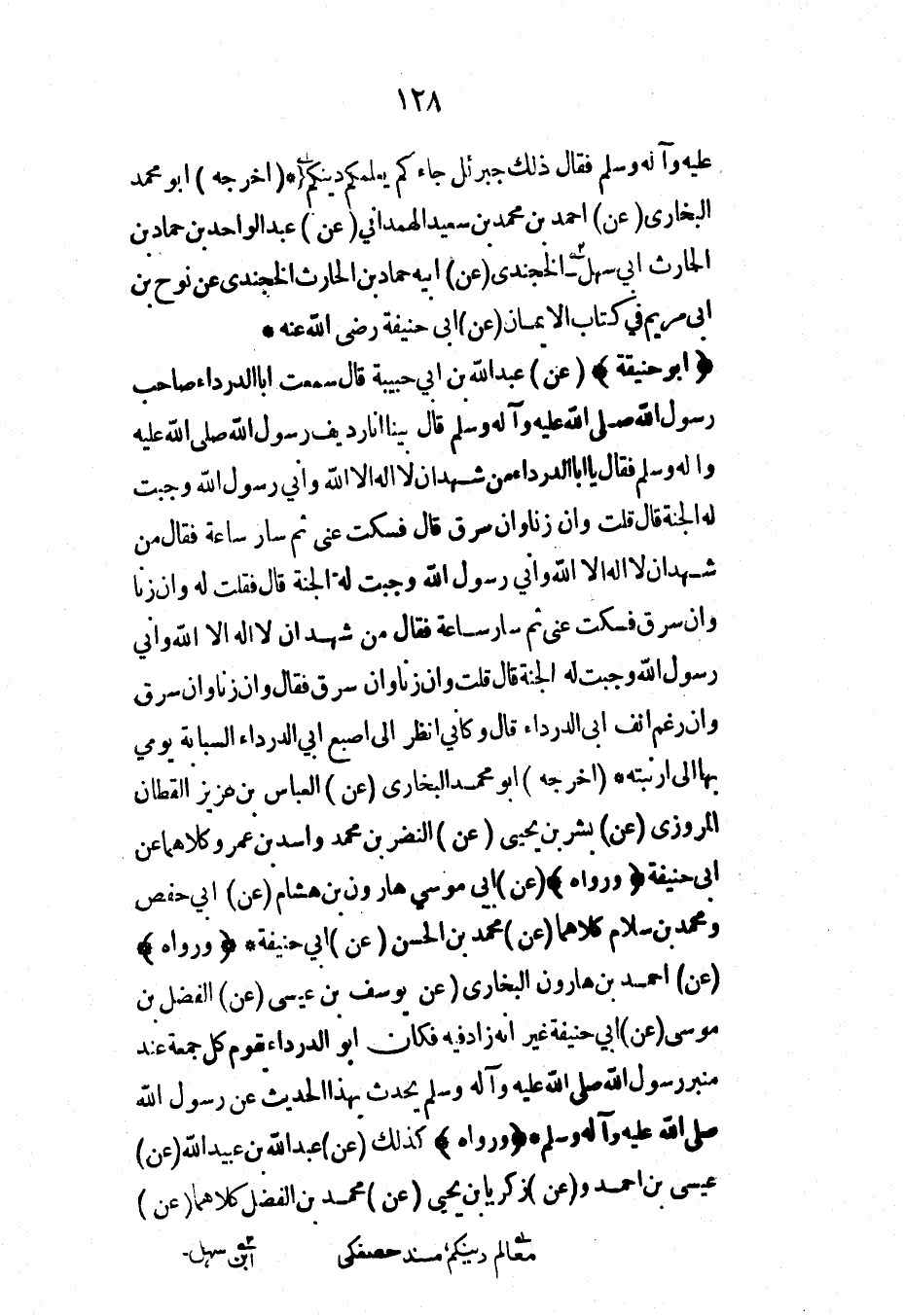 عليه وآله وسلم فقال ذلك جبرئل جاءكم يعلمكم دينكم* (أخرجه) أبو محمد البخاري (عن) أحمد بن محمد بن سعيد الهمداني (عن) عبد الواحد بن حماد بن الحارث أبي سهل الخجندي (عن) أبيه حماد بن الحارث الخجندي عن نوح بن أبي مريم في كتاب الإيمان (عن) أبي حنيفة رضي الله عنه*