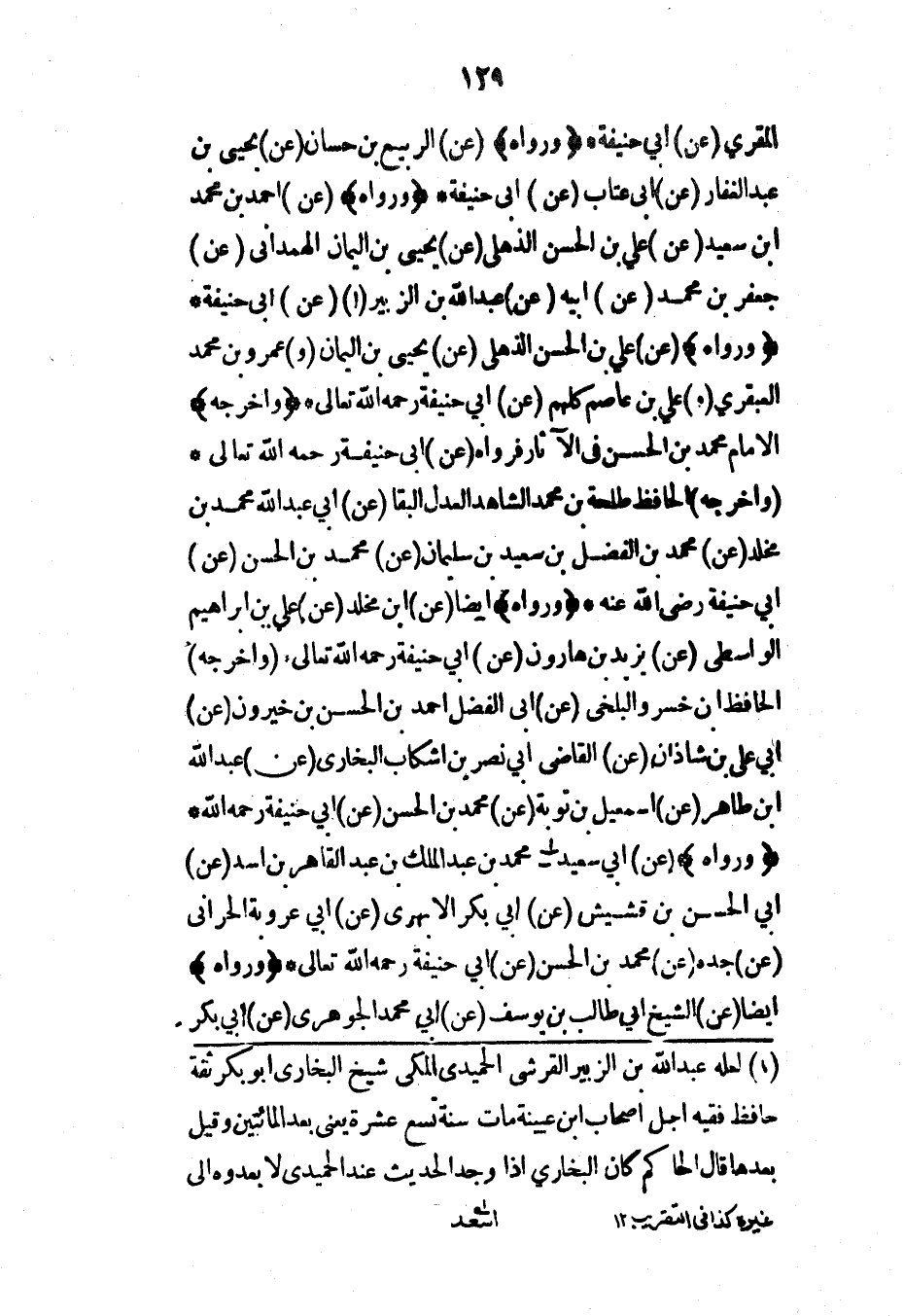 المقري (عن) أبي حنيفة* (ورواه) (عن) الربيع بن حسان (عن) يحيى بن عبد الغفار (عن) أبي عتاب (عن) أبي حنيفة* (ورواه) (عن) أحمد بن محمد ابن سعيد (عن) علي بن الحسن الذهلي (عن) يحيى بن اليمان الهمداني (عن) جعفر بن محمد (عن) أبيه (عن) عبد الله بن الزبير (عن) أبي حنيفة* (ورواه) (عن) علي بن الحسن الذهلي (عن) يحيى بن اليمان (و) عمرو بن محمد العبقري وعلي بن عاصم كلهم (عن) أبي حنيفة رحمه الله تعالى* (وأخرجه) الإمام محمد بن الحسن في الآثار فرواه (عن) أبي حنيفة رحمه الله تعالى* (وأخرجه) الحافظ طلحة بن محمد الشاهد العدل البقا (عن) أبي عبد الله محمد بن مخلد (عن) محمد بن الفضل بن سعيد بن سليمان (عن) محمد بن الحسن (عن) أبي حنيفة رضي الله عنه* (ورواه) أيضاً (عن) ابن مخلد (عن) علي بن إبراهيم الواسطي (عن) يزيد بن هارون (عن) أبي حنيفة رحمه الله تعالى* (وأخرجه) الحافظ ابن خسرو البلخي (عن) أبي الفضل أحمد بن الحسن بن خيرون (عن) أبي علي بن شاذان (عن) القاضي أبي نصر بن اشكاب البخاري (عن) عبد الله ابن طاهر (عن) إسماعيل بن توبة (عن) محمد بن الحسن (عن) أبي حنيفة رحمه الله* (ورواه) (عن) أبي سعيد محمد بن عبد الملك بن عبد القاهر بن أسد (عن) أبي الحسن بن قشيش (عن) أبي بكر الأبهري (عن) أبي عروبة الحراني (عن) جده (عن) محمد بن الحسن (عن) أبي حنيفة رحمه الله تعالى* (ورواه) أيضاً (عن) الشيخ أبي طالب بن يوسف (عن) أبي محمد الجوهري (عن) أبي بكر
