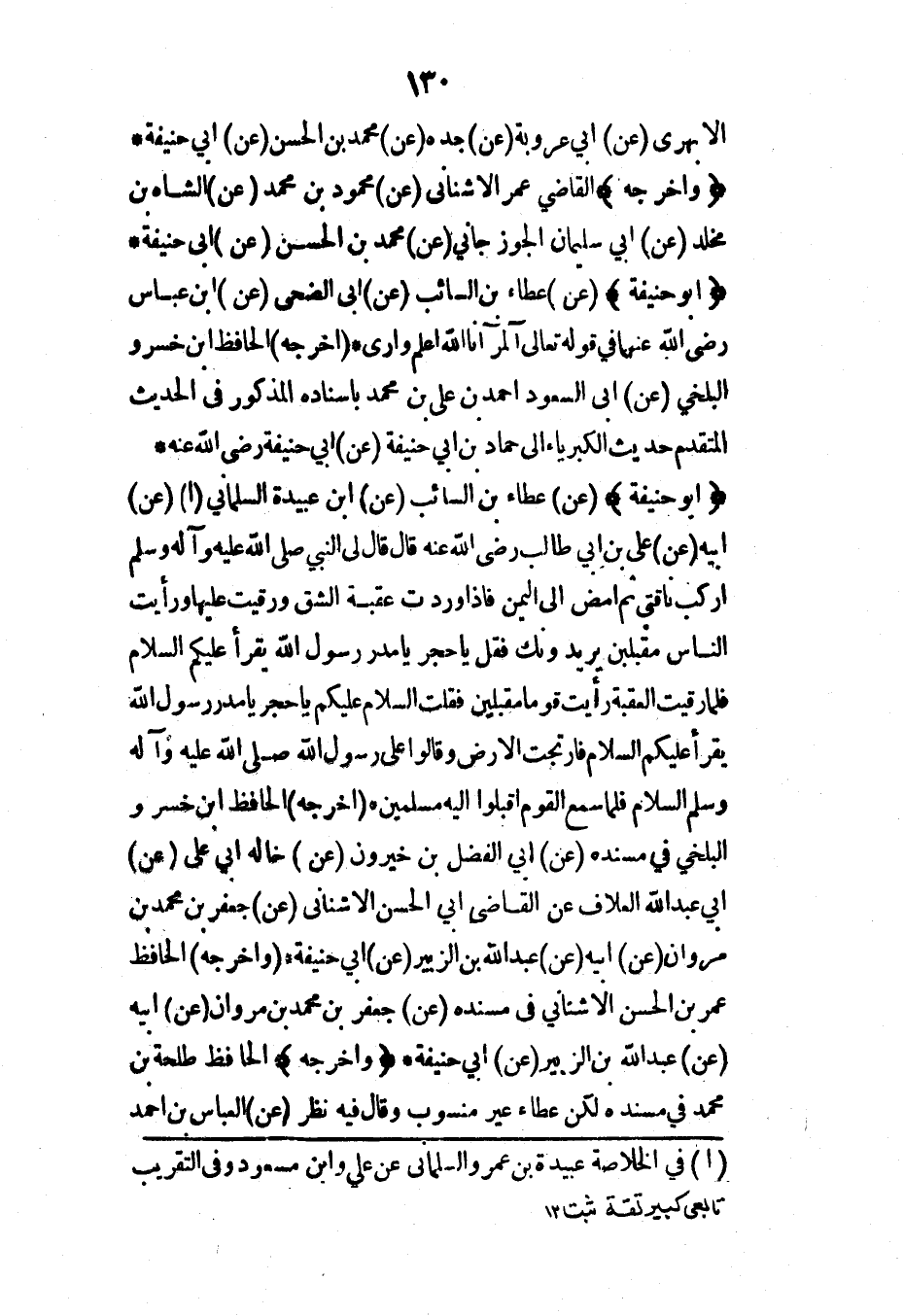 (أبو حنيفة) (عن) عطاء بن السائب (عن) ابن عبيدة السلماني (عن) أبيه (عن) علي بن أبي طالب رضي الله عنه قال لي النبي صلى الله عليه وآله وسلم اركب ناقتي ثم امض إلى اليمن فإذا وردت عقبة الشق ورقيت عليها ورأيت الناس مقبلين يريدونك فقل يا حجر يا مدر رسول الله يقرأ عليكم السلام فلما رقيت العقبة رأيت قوماً مقبلين فقلت السلام عليكم يا حجر يا مدر رسول الله يقرأ عليكم السلام فارتجت الأرض وقالوا على رسول الله صلى الله عليه وآله وسلم السلام فلما سمع القوم أقبلوا إليه مسلمين* (أخرجه) الحافظ ابن خسرو البلخي في مسنده (عن) أبي الفضل بن خيرون (عن) خاله أبي علي (عن) أبي عبد الله العلاف عن القاضي أبي الحسن الأشناني (عن) جعفر بن محمد بن مروان (عن) أبيه (عن) عبد الله بن الزبير (عن) أبي حنيفة* (وأخرجه) الحافظ عمر بن الحسن الأشناني في مسنده (عن) جعفر بن محمد بن مروان (عن) أبيه (عن) عبد الله بن الزبير (عن) أبي حنيفة* (وأخرجه) الحافظ طلحة بن محمد في مسنده لكن عطاء غير منسوب وقال فيه نظر (عن) العباس بن أحمد