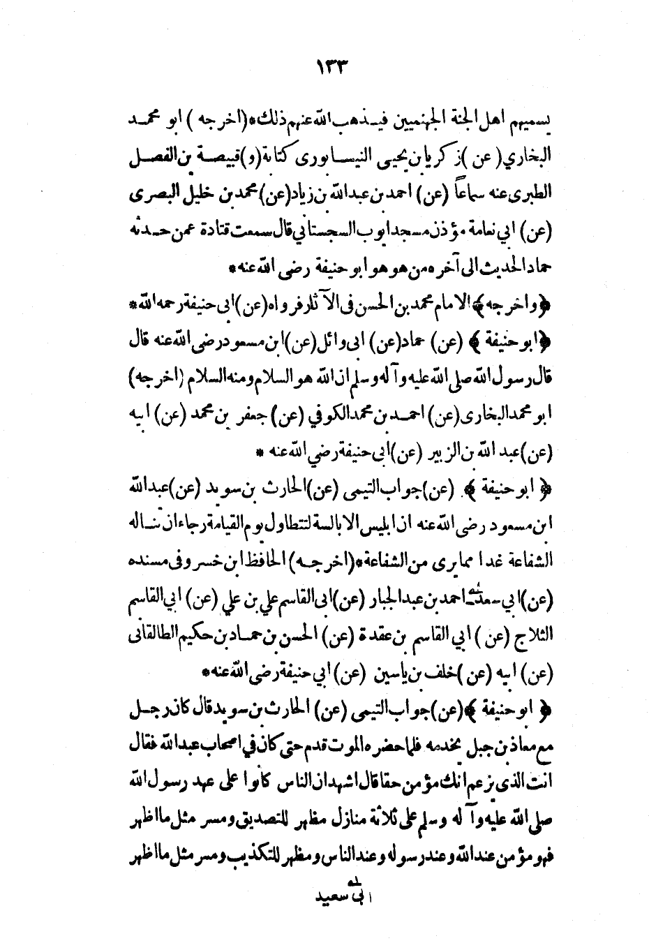 (أبو حنيفة) (عن) حماد (عن) أبي وائل (عن) ابن مسعود رضي الله عنه قال قال رسول الله صلى الله عليه وآله وسلم إن الله هو السلام ومنه السلام (أخرجه) أبو محمد البخاري (عن) أحمد بن محمد الكوفي (عن) جعفر بن محمد (عن) أبيه (عن) عبد الله بن الزبير (عن) أبي حنيفة رضي الله عنه*