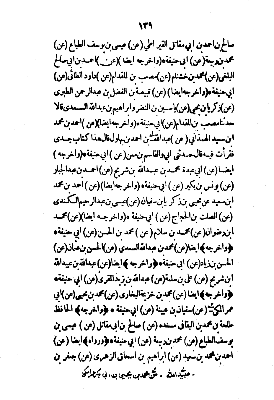 صالح بن أحمد بن أبي مقاتل القيراطي (عن) عيسى بن يوسف الطباع (عن) محمد بن ربيعة (عن) أبي حنيفة* (وأخرجه أيضاً) (عن) أحمد بن أبي صالح البلخي (عن) محمد بن خشنام (عن) مصعب بن المقدام (عن) داود الطائي (عن) أبي حنيفة* (وأخرجه أيضاً) (عن) قبيصة بن الفضل بن عبد الرحمن الطبري (عن) زكريا بن يحيى (عن) ياسين بن النضر وإبراهيم بن عبد الله السعدي قالا حدثنا مصعب بن المقدام (عن) أبي حنيفة* (وأخرجه أيضاً) (عن) أحمد بن محمد ابن سعيد الهمذاني (عن) عبد الله بن أحمد بن بهلول قال هذا كتاب جدي فقرأت فيه قال حدثني أبي والقاسم بن معن (عن) أبي حنيفة* (وأخرجه) أيضاً (عن) أبي عبدة محمد بن عبد الله بن شريح (عن) أحمد بن عبد الجبار (عن) يونس بن بكير (عن) أبي حنيفة* (وأخرجه أيضاً) (عن) أحمد بن محمد ابن سعيد (عن) يحيى بن زكريا بن سفيان (عن) عيسى بن عبد الرحيم الكندي (عن) السلط بن الحجاج (عن) أبي حنيفة* (وأخرجه أيضاً) (عن) محمد ابن رضوان (عن) محمد بن سلام (عن) محمد بن الحسن (عن) أبي حنيفة* (وأخرجه) أيضاً (عن) محمد بن عبد الله السعدي (عن) الحسن بن عثمان (عن) الحسن بن زياد (عن) أبي حنيفة* (وأخرجه) أيضاً (عن) عبد الله بن عبيد الله ابن شريح (عن) علي بن سلمة (عن) عبد الله بن يزيد المقري (عن) أبي حنيفة* (وأخرجه) أيضاً (عن) محمد بن خزيمة البخاري (عن) محمد بن يحيى (عن) أبي عمر المكي (عن) سفيان بن عيينة (عن) أبي حنيفة* (وأخرجه) الحافظ طلحة بن محمد بن البقا في مسنده (عن) صالح بن أبي مقاتل (عن) عيسى بن يوسف الطباع (عن) محمد بن ربيعة (عن) أبي حنيفة* (ورواه) أيضاً (عن) أحمد بن محمد بن سعيد (عن) إبراهيم بن إسحاق الزهري (عن) جعفر بن