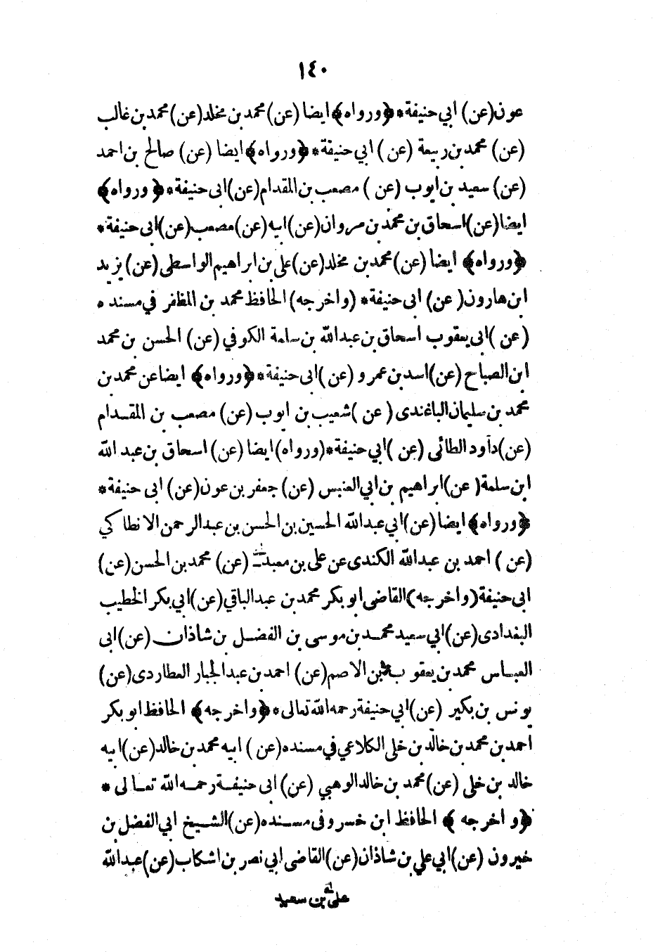 عون (عن) أبي حنيفة* (ورواه) أيضاً (عن) محمد بن مخلد (عن) محمد بن غالب (عن) محمد بن ربيعة (عن) أبي حنيفة* (ورواه) أيضاً (عن) صالح بن أحمد (عن) سعيد بن أيوب (عن) مصعب بن المقدام (عن) أبي حنيفة* (ورواه) أيضاً (عن) إسحاق بن محمد بن مروان (عن) أبيه (عن) مصعب (عن) أبي حنيفة* (ورواه) أيضاً (عن) محمد بن مخلد (عن) علي بن إبراهيم الواسطي (عن) يزيد ابن هارون (عن) أبي حنيفة* (وأخرجه) الحافظ محمد بن المظفر في مسنده (عن) أبي يعقوب إسحاق بن عبد الله بن سلمة الكوفي (عن) الحسن بن محمد ابن الصباح (عن) أسد بن عمرو (عن) أبي حنيفة* (ورواه) أيضاً عن محمد بن محمد بن سليمان الباغندي (عن) شعيب بن أيوب (عن) مصعب بن المقدام (عن) داود الطائي (عن) أبي حنيفة* (ورواه) أيضاً (عن) إسحاق بن عبد الله ابن سلمة (عن) إبراهيم بن أبي العنبس (عن) جعفر بن عون (عن) أبي حنيفة* (ورواه) أيضاً (عن) أبي عبد الله الحسين بن الحسن بن عبد الرحمن الأنطاكي (عن) أحمد بن عبد الله الكندي عن علي بن معبد (عن) محمد بن الحسن (عن) أبي حنيفة (وأخرجه) القاضي أبو بكر محمد بن عبد الباقي (عن) أبي بكر الخطيب البغدادي (عن) أبي سعيد محمد بن موسى بن الفضل بن شاذان (عن) أبي العباس محمد بن يعقوب بن الأصم (عن) أحمد بن عبد الجبار العطاردي (عن) يونس بن بكير (عن) أبي حنيفة رحمه الله تعالى* (وأخرجه) الحافظ أبو بكر أحمد بن محمد بن خالد بن خلي الكلاعي في مسنده (عن) أبيه محمد بن خالد (عن) أبيه خالد بن خلي (عن) محمد بن خالد الوهبي (عن) أبي حنيفة رحمه الله تعالى* (وأخرجه) الحافظ ابن خسرو في مسنده (عن) الشيخ أبي الفضل بن خيرون (عن) أبي علي بن شاذان (عن) القاضي أبي نصر بن اشكاب (عن) عبد الله