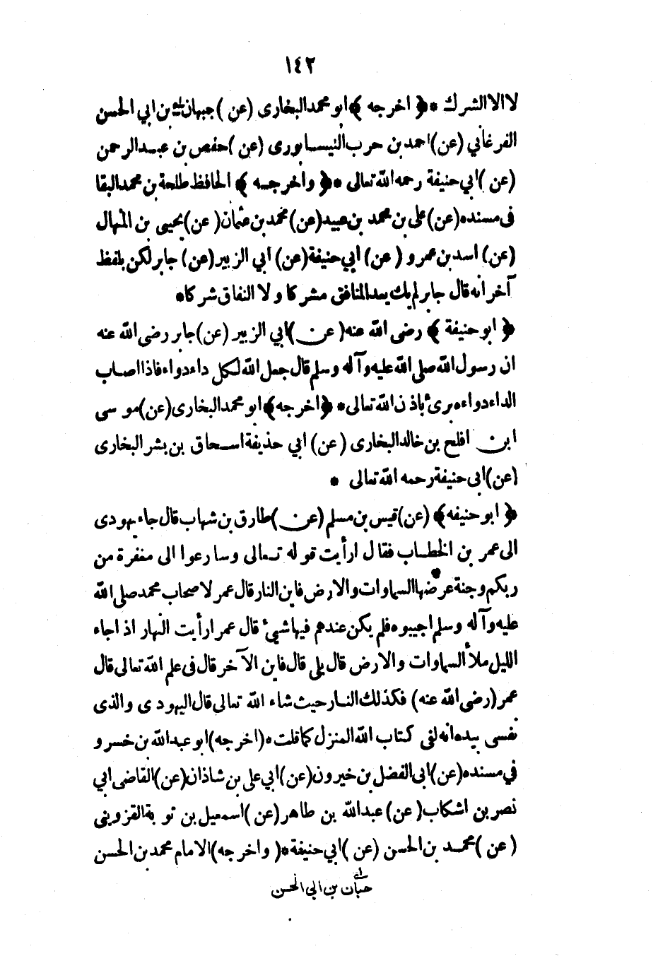 لا إلا الشرك* (أخرجه) أبو محمد البخاري (عن) جبهان بن أبي الحسن الفرغاني (عن) أحمد بن حرب النيسابوري (عن) حفص بن عبد الرحمن (عن) أبي حنيفة رحمه الله تعالى* (وأخرجه) الحافظ طلحة بن محمد البقا في مسنده (عن) علي بن محمد بن عبيد (عن) محمد بن عثمان (عن) يحيى بن المنهال (عن) أسد بن عمرو (عن) أبي حنيفة (عن) أبي الزبير (عن) جابر لكن بلفظ آخر أنه قال جابر لم يك يعد المنافق مشركاً ولا النفاق شركاً*