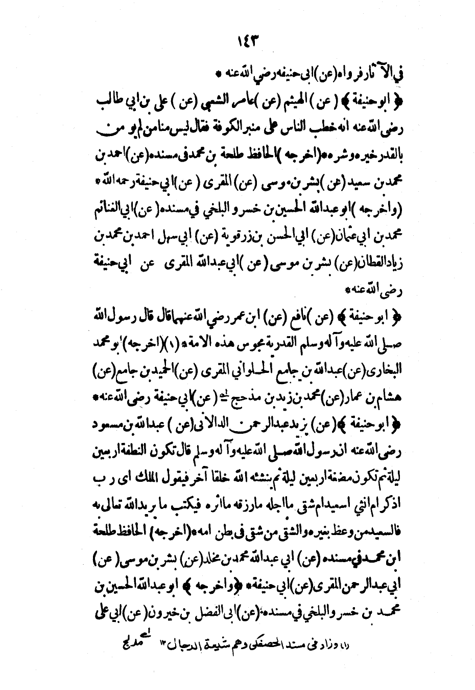 (أبو حنيفة) (عن) نافع (عن) ابن عمر رضي الله عنهما قال قال رسول الله صلى الله عليه وآله وسلم القدرية مجوس هذه الأمة* (أخرجه) أبو محمد البخاري (عن) عبد الله بن جامع الحلواني المقري (عن) الحميد بن جامع (عن) هشام بن عمار (عن) محمد بن زيد بن مذحج (عن) أبي حنيفة رضي الله عنه*