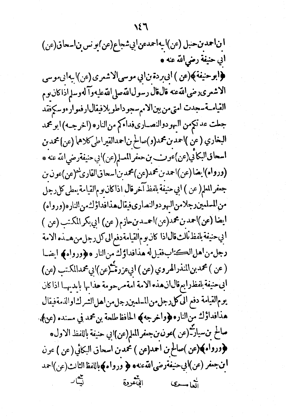 (أبو حنيفة) (عن) أبي بردة بن أبي موسى الأشعري (عن) أبيه أبي موسى الأشعري رضي الله عنه قال قال رسول الله صلى الله عليه وآله وسلم إذا كان يوم القيامة سجدت أمتي من بين الأمم سجوداً طويلاً فيقال ارفعوا رءوسكم فقد جعلت عدتكم من اليهود والنصارى فداءكم من النار* (أخرجه) أبو محمد البخاري (عن) أحمد بن محمد (و) صالح بن أحمد القيراطي كلاهما (عن) محمد بن إسحاق البكائي (عن) عون بن جعفر المعلم (عن) أبي حنيفة رضي الله عنه* (ورواه) أيضاً (عن) أحمد بن محمد (عن) محمد بن إسحاق القاري (عن) عون بن جعفر المعلم (عن) أبي حنيفة بلفظ آخر قال إذا كان يوم القيامة يعطى كل رجل من المسلمين رجلاً من اليهود والنصارى فيقال هذا فداؤك من النار* (ورواه) أيضاً (عن) أحمد بن محمد (عن) أحمد بن حازم (عن) أبي بكر المكتب (عن) أبي حنيفة بلفظ ثالث قال إذا كان يوم القيامة دفع إلى كل رجل من هذه الأمة رجل من أهل الكتاب فقيل له هذا فداؤك من النار* (ورواه) أيضاً (عن) محمد بن المنذر الهروي (عن) أبي عزرة (عن) أبي محمد المكتب (عن) أبي حنيفة بلفظ رابع قال إن هذه الأمة أمة مرحومة عذابها بأيديها إذا كان يوم القيامة دفع إلى كل رجل من المسلمين رجل من أهل الشرك أو الذمة فيقال هذا فداؤك من النار* (وأخرجه) الحافظ طلحة بن محمد في مسنده (عن) صالح بن سيار (عن) عون بن جعفر المعلم (عن) أبي حنيفة باللفظ الأول*