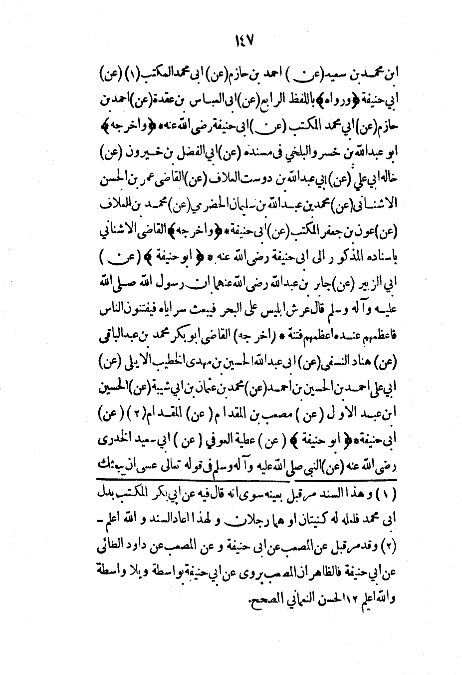 ابن محمد بن سعيد (عن) أحمد بن حازم (عن) أبي محمد المكتب (عن) أبي حنيفة (ورواه) باللفظ الرابع (عن) أبي العباس بن عقدة (عن) أحمد بن حازم (عن) أبي محمد المكتب (عن) أبي حنيفة رضي الله عنه* (وأخرجه) أبو عبد الله بن خسرو البلخي في مسنده (عن) أبي الفضل بن خيرون (عن) خاله أبي علي (عن) أبي عبد الله بن دوست العلاف (عن) القاضي عمر بن الحسن الأشناني (عن) محمد بن عبد الله بن سليمان الحضرمي (عن) محمد بن العلاف (عن) عون بن جعفر المكتب (عن) أبي حنيفة* (وأخرجه) القاضي الأشناني بإسناده المذكور إلى أبي حنيفة رضي الله عنه* (أبو حنيفة) (عن) أبي الزبير (عن) جابر بن عبد الله رضي الله عنهما أن رسول الله صلى الله عليه وآله وسلم قال عرش إبليس على البحر فيبعث سراياه فيفتنون الناس فأعظمهم عنده أعظمهم فتنة* (أخرجه) القاضي أبو بكر محمد بن عبد الباقي (عن) هناد النسفي (عن) أبي عبد الله الحسين بن مهدي الخطيب الأيلي (عن) أبي علي أحمد بن الحسين بن أحمد (عن) محمد بن عثمان بن أبي شيبة (عن) الحسين ابن عبد الأول (عن) مصعب بن المقدام (عن) المقدام (عن) أبي حنيفة* (أبو حنيفة) (عن) عطية العوفي (عن) أبي سعيد الخدري رضي الله عنه (عن) النبي صلى الله عليه وآله وسلم في قوله تعالى {عسى أن يبعثك