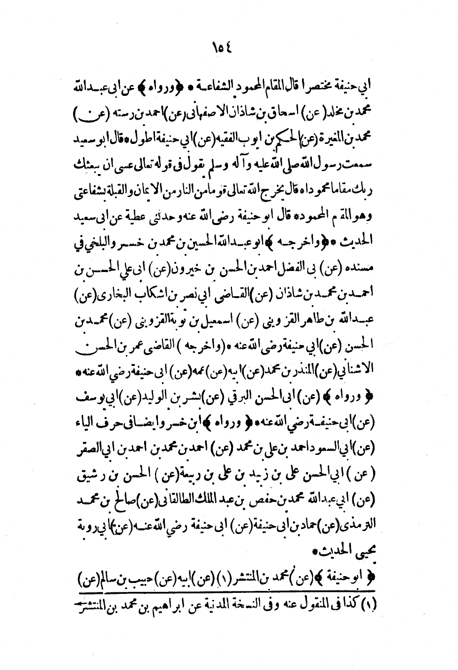 أبي حنيفة مختصراً قال المقام المحمود الشفاعة* (ورواه) عن أبي عبد الله محمد بن مخلد (عن) إسحاق بن شاذان الأصفهاني (عن) أحمد بن رسته (عن) محمد بن المغيرة (عن) الحكم بن أيوب الفقيه (عن) أبي حنيفة أطول* قال أبو سعيد سمعت رسول الله صلى الله عليه وآله وسلم يقول في قوله تعالى {عسى أن يبعثك ربك مقاماً محموداً} قال يخرج الله تعالى قوماً من النار من الإيمان والقبلة بشفاعتي وهو المقام المحمود قال أبو حنيفة رضي الله عنه وحدثني عطية عن أبي سعيد الحديث* (وأخرجه) أبو عبد الله الحسين بن محمد بن خسرو البلخي في مسنده (عن) أبي الفضل أحمد بن الحسن بن خيرون (عن) أبي علي الحسن بن أحمد بن محمد بن شاذان (عن) القاضي أبي نصر بن اشكاب البخاري (عن) عبد الله بن طاهر القزويني (عن) إسماعيل بن توبة القزويني (عن) محمد بن الحسن (عن) أبي حنيفة رضي الله عنه* (وأخرجه) القاضي عمر بن الحسن الأشناني (عن) المنذر بن محمد (عن) أبيه (عن) عمه (عن) أبي حنيفة رضي الله عنه* (ورواه) (عن) أبي الحسن البرقي (عن) بشر بن الوليد (عن) أبي يوسف (عن) أبي حنيفة رضي الله عنه* (ورواه) ابن خسرو أيضاً في حرف الياء (عن) أبي السعود أحمد بن علي بن محمد (عن) أحمد بن محمد بن أحمد بن أبي الصقر (عن) أبي الحسن علي بن زبيد بن علي بن ربيعة (عن) الحسن بن رشيق (عن) أبي عبد الله محمد بن حفص بن عبد الملك الطالقاني (عن) صالح بن محمد الترمذي (عن) حماد بن أبي حنيفة (عن) أبي حنيفة رضي الله عنه (عن) أبي روبة يحيى الحديث*