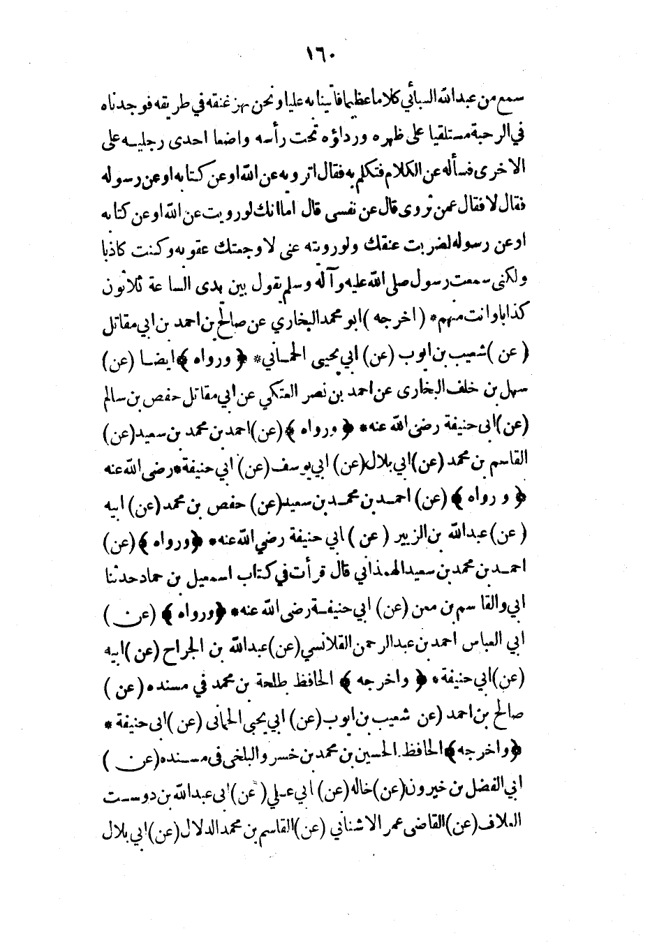 سمع من عبد الله السبائي كلاماً عظيماً فأتينا به علياً ونحن نهز عنقه في طريقه فوجدناه في الرحبة مستلقياً على ظهره ورداءه تحت رأسه واضعاً إحدى رجليه على الأخرى فسأله عن الكلام فتكلم به فقال أترويه عن الله أو عن كتابه أو عن رسوله فقال لا فقال عمن تروي قال عن نفسي قال أما إنك لو رويت عن الله أو عن كتابه أو عن رسوله لضربت عنقك ولو رويته عني لأوجعتك عقوبة وكنت كاذباً ولكني سمعت رسول الله صلى الله عليه وآله وسلم يقول بين يدي الساعة ثلاثون كذاباً وأنت منهم* (أخرجه) أبو محمد البخاري عن صالح بن أحمد بن أبي مقاتل (عن) شعيب بن أيوب (عن) أبي يحيى الحماني* (ورواه) أيضاً (عن) سهل بن خلف البخاري عن أحمد بن نصر العتكي عن أبي مقاتل حفص بن سالم (عن) أبي حنيفة رضي الله عنه* (ورواه) (عن) أحمد بن محمد بن سعيد (عن) القاسم بن محمد (عن) أبي بلال (عن) أبي يوسف (عن) أبي حنيفة رضي الله عنه* (ورواه) (عن) أحمد بن محمد بن سعيد (عن) حفص بن محمد (عن) أبيه (عن) عبد الله بن الزبير (عن) أبي حنيفة رضي الله عنه* (ورواه) (عن) أحمد بن محمد بن سعيد الهمذاني قال قرأت في كتاب إسماعيل بن حماد حدثنا أبي والقاسم بن معن (عن) أبي حنيفة رضي الله عنه* (ورواه) (عن) أبي العباس أحمد بن عبد الرحمن القلانسي (عن) عبد الله بن الجراح (عن) أبيه (عن) أبي حنيفة* (وأخرجه) الحافظ طلحة بن محمد في مسنده (عن) صالح بن أحمد (عن) شعيب بن أيوب (عن) أبي يحيى الحماني (عن) أبي حنيفة* (وأخرجه) الحافظ الحسين بن محمد بن خسرو البلخي في مسنده (عن) أبي الفضل بن خيرون (عن) خاله (عن) أبي علي (عن) أبي عبد الله بن دوست العلاف (عن) القاضي عمر الأشناني (عن) القاسم بن محمد الدلال (عن) أبي بلال