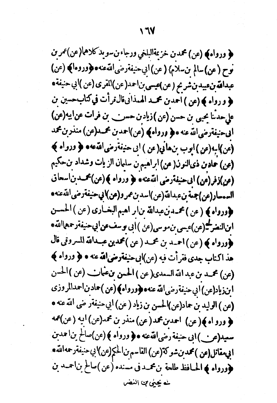 (ورواه) (عن) محمد بن خزيمة البلخي ورجاء بن سويد كلاهما (عن) عمر بن نوح (عن) سالم بن سلام (عن) أبي حنيفة رضي الله عنه* (ورواه) (عن) عبد الله بن عبيد بن شريح (عن) عيسى بن أحمد (عن) المقري (عن) أبي حنيفة* (ورواه) (عن) أحمد بن محمد الهمذاني قال قرأت في كتاب حسين بن علي حدثنا يحيى بن حسن (عن) زياد بن حسن بن فرات عن أبيه (عن) أبي حنيفة رضي الله عنه* (ورواه) (عن) أحمد بن محمد (عن) منذر بن محمد (عن) أبيه (عن) أيوب بن هاني (عن) أبي حنيفة رضي الله عنه* (ورواه) (عن) حماد بن ذي النون (عن) إبراهيم بن سليمان الزيات وشداد بن حكيم (عن) زفر (عن) أبي حنيفة رضي الله عنه* (ورواه) (عن) محمد بن إسحاق السمسار (عن) جمعة بن عبد الله (عن) أسد بن عمرو (عن) أبي حنيفة رضي الله عنه* (ورواه) (عن) محمد بن عبد الله بن إبراهيم البخاري (عن) الحسن ابن النضر (عن) عيسى بن موسى (عن) أبي يوسف عن أبي حنيفة رحمهما الله* (ورواه) (عن) أحمد بن محمد (عن) محمد بن عبد الله المسروقي قال هذا كتاب جدي فقرأت فيه (عن) أبي حنيفة رضي الله عنه* (ورواه) (عن) محمد بن عبد الله السعدي (عن) الحسن بن عثمان (عن) الحسن ابن زياد (عن) أبي حنيفة رضي الله عنه* (ورواه) (عن) حماد بن أحمد المروزي (عن) الوليد بن حماد (عن) الحسن بن زياد (عن) أبي حنيفة رضي الله عنه* (ورواه) (عن) أحمد بن محمد (عن) منذر بن محمد (عن) أبيه (عن) عمه سعيد (عن) أبي حنيفة رضي الله عنه* (ورواه) (عن) صالح بن أحمد بن أبي مقاتل (عن) محمد بن شوكة (عن) القاسم بن الحكم (عن) أبي حنيفة رحمه الله* (ورواه) الحافظ طلحة بن محمد في مسنده (عن) صالح بن أحمد بن