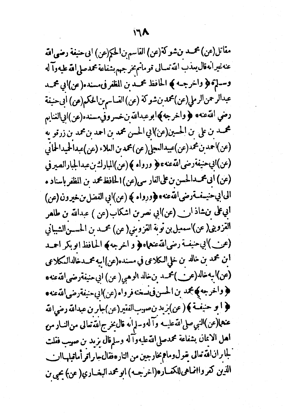 مقاتل (عن) محمد بن شوكة (عن) القاسم بن الحكم (عن) أبي حنيفة رضي الله عنه غير أنه قال يعذب الله تعالى قوماً ثم يخرجهم بشفاعة محمد صلى الله عليه وآله وسلم (وأخرجه) الحافظ محمد بن المظفر في مسنده (عن) أبي محمد عبد الرحمن الرملي (عن) محمد بن شوكة (عن) القاسم بن الحكم (عن) أبي حنيفة رضي الله عنه* (وأخرجه) أبو عبد الله بن خسرو في مسنده (عن) أبي الغنايم محمد بن علي بن الحسين (عن) أبي الحسن محمد بن أحمد بن محمد بن زرقويه (عن) أحمد بن محمد (عن) عبيد العجلي (عن) محمد بن العلاء (عن) عبد الحميد الحماني (عن) أبي حنيفة رضي الله عنه* (ورواه) (عن) المبارك بن عبد الجبار الصيرفي (عن) أبي محمد الحسن بن علي الفارسي (عن) الحافظ محمد بن المظفر بإسناده إلى أبي حنيفة رضي الله عنه* (ورواه) (عن) أبي الفضل بن خيرون (عن) أبي علي بن شاذان (عن) أبي نصر بن اشكاب (عن) عبد الله بن طاهر القزويني (عن) إسماعيل بن توبة القزويني (عن) محمد بن الحسن الشيباني (عن) أبي حنيفة رضي الله عنهما* (وأخرجه) الحافظ أبو بكر أحمد ابن محمد بن خالد بن خلي الكلاعي في مسنده (عن) أبيه محمد خالد الكلاعي (عن) أبيه خالد (عن) محمد بن خالد الوهبي (عن) أبي حنيفة رضي الله عنه* (وأخرجه) محمد بن الحسن في نسخته فرواه (عن) أبي حنيفة رضي الله عنه*