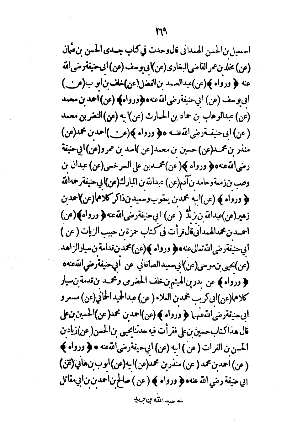 إسماعيل بن الحسن الهمداني قال وجدت في كتاب جدي الحسن بن عثمان (عن) مخلد بن عمر القاضي البخاري (عن) أبي يوسف (عن) أبي حنيفة رضي الله عنه (ورواه) (عن) عبد الصمد بن الفضل (عن) خلف بن أيوب (عن) أبي يوسف (عن) أبي حنيفة رضي الله عنه* (ورواه) (عن) أحمد بن محمد (عن) عبد الوهاب بن حماد بن الحارث (عن) أبيه (عن) النضر بن محمد (عن) أبي حنيفة رضي الله عنه* (ورواه) (عن) أحمد بن محمد (عن) منذر بن محمد (عن) حسين بن محمد (عن) أسد بن عمرو (عن) أبي حنيفة رضي الله عنه* (ورواه) (عن) محمد بن علي السرخسي (عن) عبدان بن وهب بن زمعة وحامد بن آدم (عن) عبد الله بن المبارك (عن) أبي حنيفة رحمه الله (ورواه) (عن) أبيه محمد بن يعقوب وسعيد بن ذاكر كلاهما (عن) أحمد بن زهير (عن) عبد الله بن يزيد (عن) أبي حنيفة رضي الله عنه (ورواه) (عن) أحمد بن محمد الهمداني قال قرأت في كتاب حمزة بن حبيب الزيات (عن) أبي حنيفة رضي الله تعالى عنه (ورواه) (عن) محمد بن قدامة بن سيار الزاهد (عن) يحيى بن موسى (عن) أبي سعيد الصاغاني عن أبي حنيفة رضي الله عنه* (ورواه) عن بدر بن الهيثم بن خلف الحضرمي ومحمد بن قدامة بن سيار كلاهما (عن) أبي كريب محمد بن العلاء (عن) عبد الحميد الحماني (عن) مسعر وأبي حنيفة رضي الله عنهما (ورواه) (عن) أحمد بن محمد (عن) الحسين بن علي قال هذا كتاب حسين بن علي فقرأت فيه حدثنا يحيى بن الحسن (عن) زياد بن الحسن بن الفرات (عن) أبيه (عن) أبي حنيفة رضي الله عنه* (ورواه) (عن) أحمد بن محمد (عن) منذر بن محمد (عن) أبيه (عن) أيوب بن هانئ (عن) أبي حنيفة رضي الله عنه* (ورواه) (عن) صالح بن أحمد بن أبي مقاتل