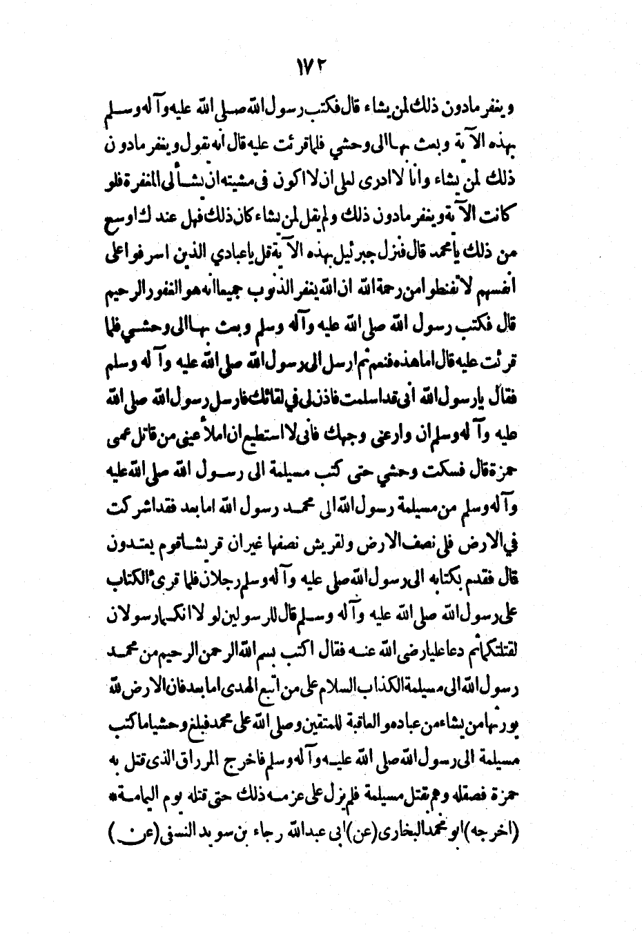 ويغفر ما دون ذلك لمن يشاء} قال فكتب رسول الله صلى الله عليه وآله وسلم بهذه الآية وبعث بها إلى وحشي فلما قرئت عليه قال إنه يقول ويغفر ما دون ذلك لمن يشاء وأنا لا أدري لعلي أن لا أكون في مشيئته أن يشأ لي المغفرة فلو كانت الآية ويغفر ما دون ذلك ولم يقل لمن يشاء كان ذلك فهل عندك أوسع من ذلك يا محمد قال فنزل جبرئيل بهذه الآية {قل يا عبادي الذين أسرفوا على أنفسكم لا تقنطوا من رحمة الله إن الله يغفر الذنوب جميعاً إنه هو الغفور الرحيم} قال فكتب رسول الله صلى الله عليه وآله وسلم وبعث بها إلى وحشي فلما قرئت عليه قال أما هذه فنعم ثم أرسل إلى رسول الله صلى الله عليه وآله وسلم فقال يا رسول الله إني قد أسلمت فأذن لي في لقائك فأرسل رسول الله صلى الله عليه وآله وسلم أن وار عني وجهك فإني لا أستطيع أن أملأ عيني من قاتل عمي حمزة قال فسكت وحشي حتى كتب مسيلمة إلى رسول الله صلى الله عليه وآله وسلم من مسيلمة رسول الله إلى محمد رسول الله أما بعد فقد أشركت في الأرض فلي نصف الأرض ولقريش نصفها غير أن قريشاً قوم يعتدون قال فقدم بكتابه إلى رسول الله صلى الله عليه وآله وسلم رجلان فلما قرئ الكتاب على رسول الله صلى الله عليه وآله وسلم قال للرسولين لولا أنكما رسولان لقتلتكما ثم دعا علياً رضي الله عنه فقال اكتب بسم الله الرحمن الرحيم من محمد رسول الله إلى مسيلمة الكذاب السلام على من اتبع الهدى أما بعد فإن الأرض لله يورثها من يشاء من عباده والعاقبة للمتقين وصلى الله على محمد فبلغ وحشياً ما كتب مسيلمة إلى رسول الله صلى الله عليه وآله وسلم فأخرج المرراق الذي قتل به حمزة فصقله وهم بقتل مسيلمة فلم يزل على عزمه ذلك حتى قتله يوم اليمامة* (أخرجه) أبو محمد البخاري (عن) أبي عبد الله رجاء بن سويد النسفي (عن)