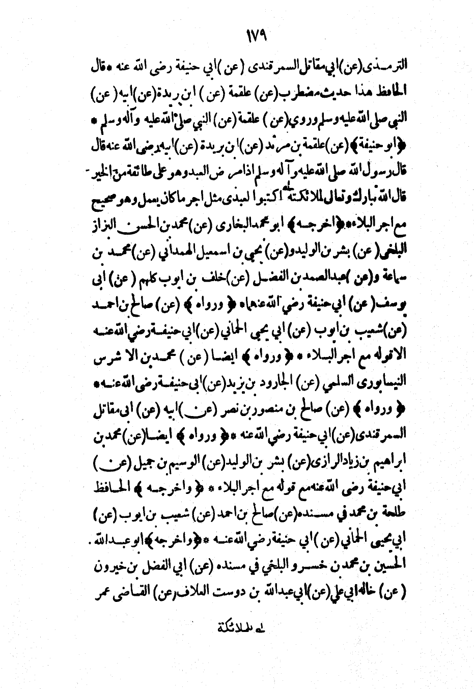 (أبو حنيفة) (عن) علقمة بن مرثد (عن) ابن بريدة (عن) أبيه رضي الله عنه قال قال رسول الله صلى الله عليه وآله وسلم إذا مرض العبد وهو على طائفة من الخير قال الله تبارك وتعالى لملائكته اكتبوا لعبدي مثل أجر ما كان يعمل وهو صحيح مع أجر البلاء* (أخرجه) أبو محمد البخاري (عن) محمد بن الحسن البزاز البلخي (عن) بشر بن الوليد و (عن) يحيى بن إسماعيل الهمداني (عن) محمد بن سماعة و (عن) عبد الصمد بن الفضل (عن) خلف بن أيوب كلهم (عن) أبي يوسف (عن) أبي حنيفة رضي الله عنهما* (ورواه) (عن) صالح بن أحمد (عن) شعيب بن أيوب (عن) أبي يحيى الحماني (عن) أبي حنيفة رضي الله عنه إلا قوله مع أجر البلاء* (ورواه) أيضاً (عن) محمد بن الأشرس النيسابوري السلمي (عن) الجارود بن يزيد (عن) أبي حنيفة رضي الله عنه* (ورواه) (عن) صالح بن منصور بن نصر (عن) أبيه (عن) أبي مقاتل السمرقندي (عن) أبي حنيفة رضي الله عنه* (ورواه) أيضاً (عن) محمد بن إبراهيم بن زياد الرازي (عن) بشر بن الوليد (عن) الوسيم بن جميل (عن) أبي حنيفة رضي الله عنه مع قوله مع أجر البلاء* (وأخرجه) الحافظ طلحة بن محمد في مسنده (عن) صالح بن أحمد (عن) شعيب بن أيوب (عن) أبي يحيى الحماني (عن) أبي حنيفة رضي الله عنه* (وأخرجه) أبو عبد الله الحسين بن محمد بن خسرو البلخي في مسنده (عن) أبي الفضل بن خيرون (عن) خاله أبي علي (عن) أبي عبد الله بن دوست العلاف (عن) القاضي عمر
