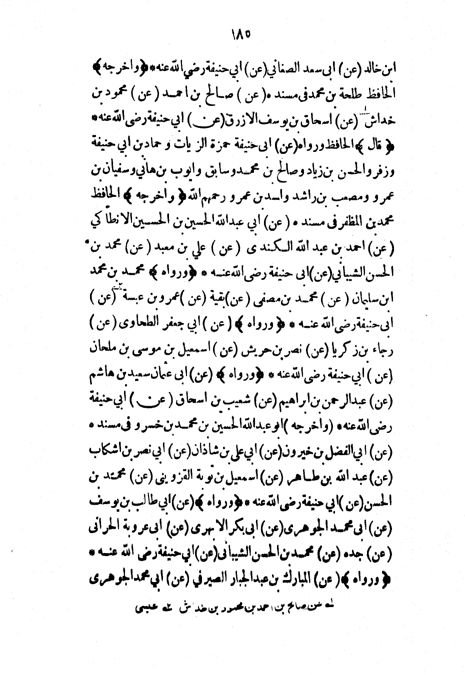 ابن خالد (عن) أبي سعد الصغاني (عن) أبي حنيفة رضي الله عنه* (وأخرجه) الحافظ طلحة بن محمد في مسنده (عن) صالح بن أحمد (عن) محمود بن خداش (عن) إسحاق بن يوسف الأزرق (عن) أبي حنيفة رضي الله عنه* (قال) الحافظ ورواه (عن) أبي حنيفة حمزة الزيات وحماد بن أبي حنيفة وزفر والحسن بن زياد وصالح بن محمد وسابق وأيوب بن هاني وسفيان بن عمرو ومصعب بن راشد وأسد بن عمرو رحمهم الله (وأخرجه) الحافظ محمد بن المظفر في مسنده (عن) أبي عبد الله الحسين بن الحسين الأنطاكي (عن) أحمد بن عبد الله الكندي (عن) علي بن معبد (عن) محمد بن الحسن الشيباني (عن) أبي حنيفة رضي الله عنه* (ورواه) محمد بن محمد ابن سليمان (عن) محمد بن مصفى (عن) بقية (عن) عمرو بن عبسة (عن) أبي حنيفة رضي الله عنه* (ورواه) (عن) أبي جعفر الطحاوي (عن) رجاء بن زكريا (عن) نصر بن حريش (عن) إسماعيل بن موسى بن ملحان (عن) أبي حنيفة رضي الله عنه* (ورواه) (عن) أبي عثمان سعيد بن هاشم (عن) عبد الرحمن بن إبراهيم (عن) شعيب بن إسحاق (عن) أبي حنيفة رضي الله عنه* (وأخرجه) أبو عبد الله الحسين بن محمد بن خسرو في مسنده (عن) أبي الفضل بن خيرون (عن) أبي علي بن شاذان (عن) أبي نصر بن اشكاب (عن) عبد الله بن طاهر (عن) إسماعيل بن توبة القزويني (عن) محمد بن الحسن (عن) أبي حنيفة رضي الله عنه* (ورواه) (عن) أبي طالب بن يوسف (عن) أبي محمد الجوهري (عن) أبي بكر الأبهري (عن) أبي عروبة الحراني (عن) جده (عن) محمد بن الحسن الشيباني (عن) أبي حنيفة رضي الله عنه* (ورواه) (عن) المبارك بن عبد الجبار الصيرفي (عن) أبي محمد الجوهري