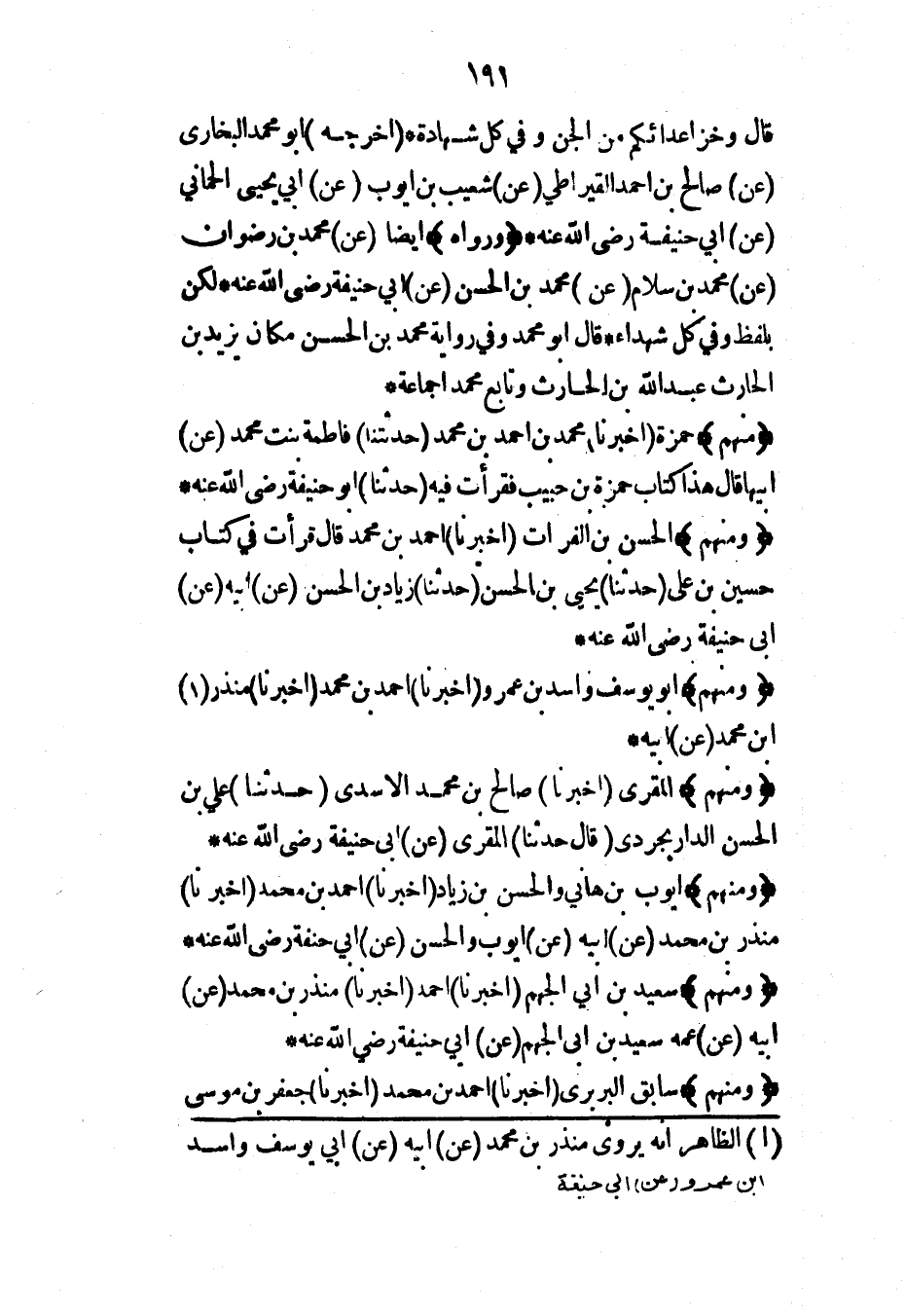 (ومنهم) أيوب بن هاني الحسن بن زياد (أخبرنا) أحمد بن محمد (أخبرنا) منذر بن محمد (عن) أبيه (عن) أيوب والحسن (عن) أبي حنيفة رضي الله عنه*