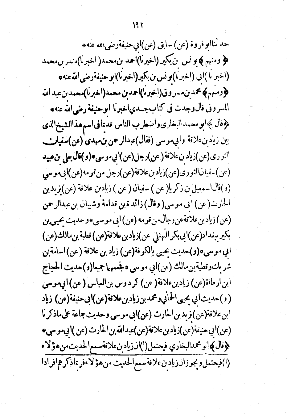 (قال) أبو محمد البخاري واضطرب الناس قديماً في اسم هذا الشيخ الذي بين زياد بن علاقة وأبي موسى (فقال) عبد الرحمن بن مهدي (عن) سفيان الثوري (عن) زياد بن علاقة (عن) رجل (عن) أبي موسى* (و) قال يعلى بن عبيد (عن) سفيان الثوري (عن) زياد بن علاقة (عن) رجل من قومه (عن) أبي موسى (و) قال إسماعيل بن زكريا (عن) سفيان (عن) زياد بن علاقة (عن) يزيد بن الحارث (عن) أبي موسى (وقال) زائدة بن قدامة وشيبان بن عبد الرحمن (عن) زياد بن علاقة عن رجال من قومه (عن) أبي موسى* وحديث يحيى بن بكير ببغداد (عن) أبي بكر النهشلي (عن) زياد بن علاقة (عن) قطبة بن مالك (عن) أبي موسى* (و) حديث يحيى بالكوفة (عن) زياد بن علاقة (عن) أسامة بن شريك وقطبة بن مالك (عن) أبي موسى* فجمعهما جميعاً (و) حديث الحجاج ابن أرطأة (عن) زياد بن علاقة (عن) كردوس بن العباس (عن) أبي موسى (و) حديث أبي يحيى الحماني ومحمد بن زياد بن علاقة (عن) أبي حنيفة (عن) زياد ابن علاقة (عن) يزيد بن الحارث (عن) أبي موسى وحديث جماعة على ما ذكرنا (عن) أبي حنيفة (عن) زياد بن علاقة (عن) عبد الله بن الحارث (عن) أبي موسى* (قال) أبو محمد البخاري فيحتمل أن زياد بن علاقة سمع الحديث من هؤلاء