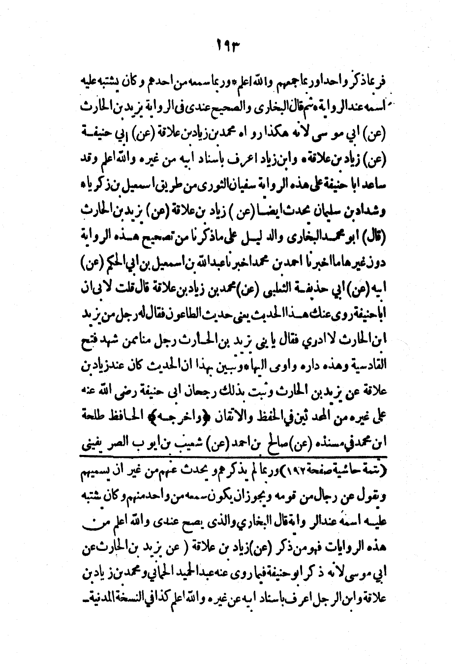 فربما ذكر واحداً وربما جمعهم والله أعلم* وربما سمعه من أحدهم وكان يشتبه عليه اسمه عند الرواية* ثم قال البخاري والصحيح عندي في الرواية يزيد بن الحارث (عن) أبي موسى لأنه هكذا رواه محمد بن زياد بن علاقة (عن) أبي حنيفة (عن) زياد بن علاقة* وابن زياد أعرف بإسناد أبيه من غيره والله أعلم وقد ساعد أبا حنيفة على هذه الرواية سفيان الثوري من طريق إسماعيل بن زكريا* وشداد بن سليمان يحدث أيضاً (عن) زياد بن علاقة (عن) يزيد بن الحارث (قال) أبو محمد البخاري والدليل على ما ذكرنا من تصحيح هذه الرواية دون غيرها ما أخبرنا أحمد بن محمد أخبرنا عبد الله بن إسماعيل بن أبي الحكم (عن) أبيه (عن) أبي حذيفة الثعلبي (عن) محمد بن زياد بن علاقة قال قلت لأبي إن أبا حنيفة روى عنك هذا الحديث يعني حديث الطاعون فقال له رجل من يزيد ابن الحارث لا أدري فقال يا بني يزيد بن الحارث رجل منا ممن شهد فتح القادسية وهذه داره وأومى إليها* وتبين بهذا أن الحديث كان عند زياد بن علاقة عن يزيد بن الحارث وثبت بذلك رجحان أبي حنيفة رضي الله عنه على غيره من المحدثين في الحفظ والإتقان (وأخرجه) الحافظ طلحة ابن محمد في مسنده (عن) صالح بن أحمد (عن) شعيب بن أيوب الصريفيني