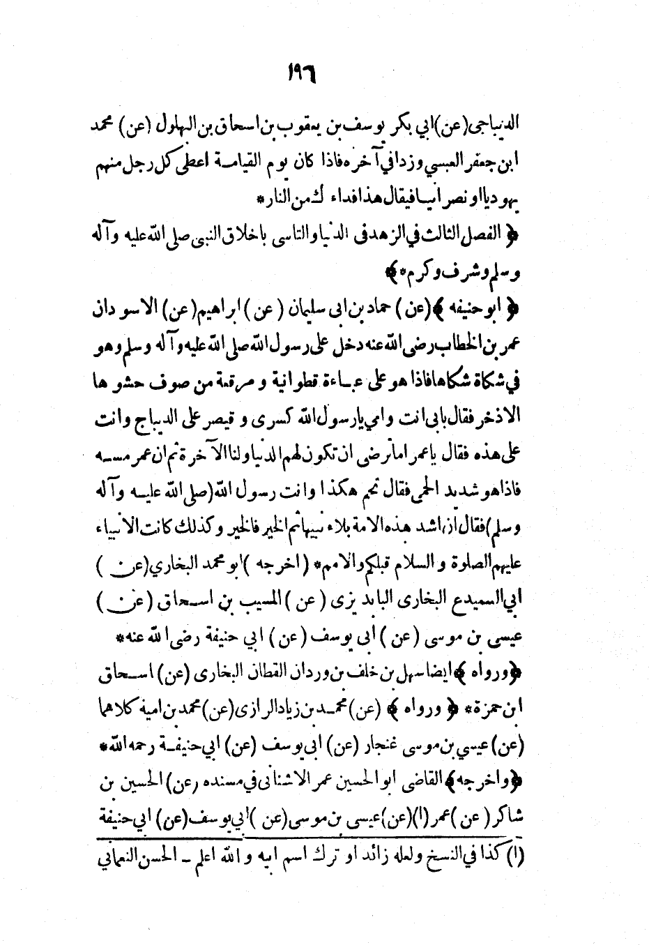 (أبو حنيفة) (عن) حماد بن أبي سليمان (عن) إبراهيم (عن) الأسود أن عمر بن الخطاب رضي الله عنه دخل على رسول الله صلى الله عليه وآله وسلم وهو في شكاة شكاها فإذا هو على عباءة قطوانية ومرقعة من صوف حشوها الأذخر فقال بأبي أنت وأمي يا رسول الله كسرى وقيصر على الديباج وأنت على هذه فقال يا عمر أما ترضى أن تكون لهم الدنيا ولنا الآخرة ثم إن عمر مسه فإذا هو شديد الحمى فقال تحم هكذا وأنت رسول الله (صلى الله عليه وآله وسلم) فقال إن أشد هذه الأمة بلاء نبيها ثم الخير فالخير وكذلك كانت الأنبياء عليهم الصلاة والسلام قبلكم والأمم* (أخرجه) أبو محمد البخاري (عن) أبي السميدع البخاري البابديزي (عن) المسيب بن إسحاق (عن) عيسى بن موسى (عن) أبي يوسف (عن) أبي حنيفة رضي الله عنه*