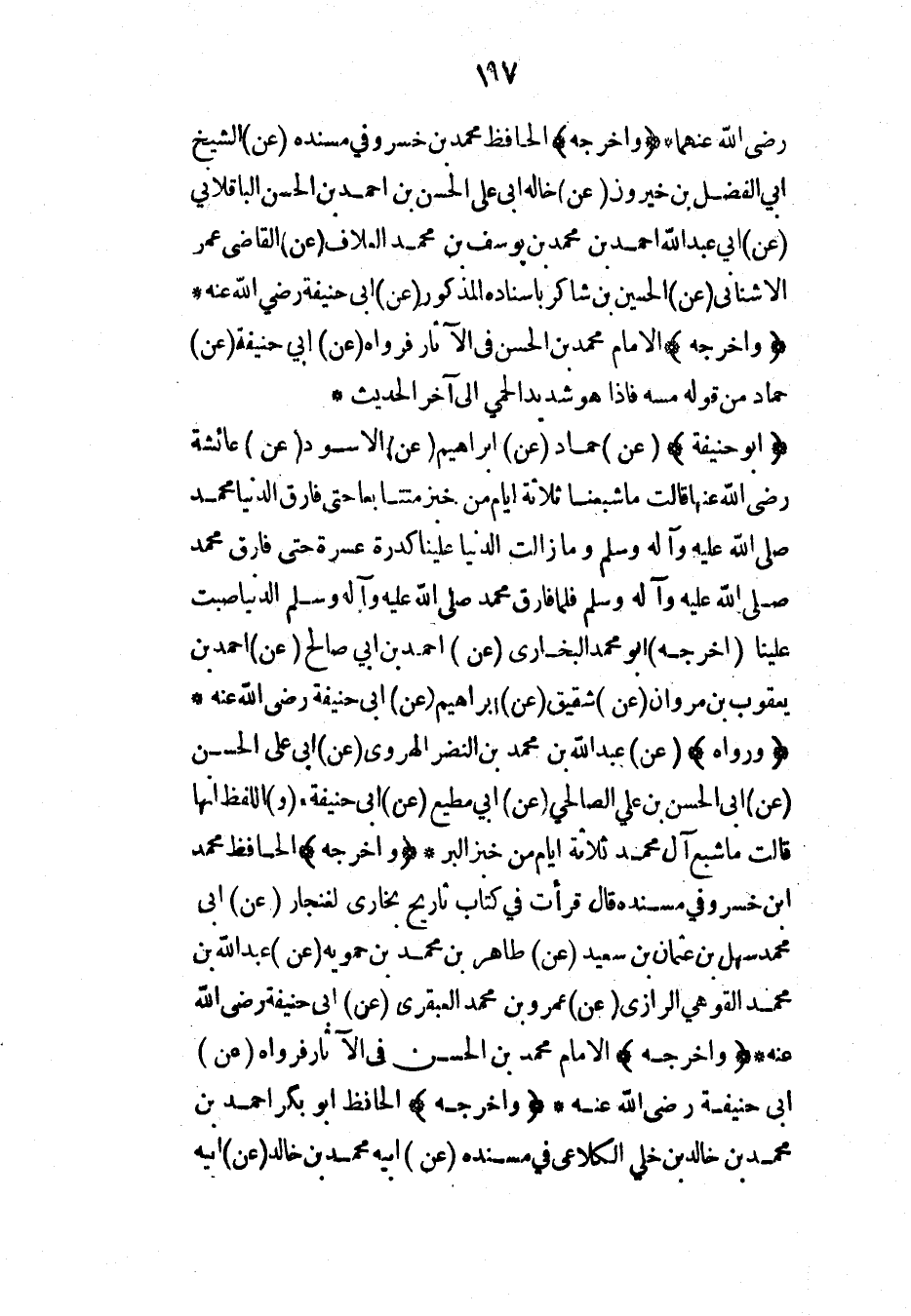 (أبو حنيفة) (عن) حماد (عن) إبراهيم (عن) الأسود (عن) عائشة رضي الله عنها قالت ما شبعنا ثلاثة أيام من خبز متتابعاً حتى فارق الدنيا محمد صلى الله عليه وآله وسلم وما زالت الدنيا علينا كدرة عسرة حتى فارق محمد صلى الله عليه وآله وسلم فلما فارق محمد صلى الله عليه وآله وسلم الدنيا صبت علينا (أخرجه) أبو محمد البخاري (عن) أحمد بن أبي صالح (عن) أحمد بن يعقوب بن مروان (عن) شقيق (عن) إبراهيم (عن) أبي حنيفة رضي الله عنه* (ورواه) (عن) عبد الله بن محمد بن النضر الهروي (عن) أبي علي الحسن (عن) أبي الحسن بن علي الصالحي (عن) أبي مطيع (عن) أبي حنيفة* (و) اللفظ أنها قالت ما شبع آل محمد ثلاثة أيام من خبز البر* (وأخرجه) الحافظ محمد ابن خسرو في مسنده قال قرأت في كتاب تاريخ بخارى لغنجار (عن) أبي محمد سهل بن عثمان بن سعيد (عن) طاهر بن محمد بن حمويه (عن) عبد الله بن محمد القوهي الرازي (عن) عمرو بن محمد العبقري (عن) أبي حنيفة رضي الله عنه* (وأخرجه) الإمام محمد بن الحسن في الآثار فرواه (عن) أبي حنيفة رضي الله عنه* (وأخرجه) الحافظ أبو بكر أحمد بن محمد بن خالد بن خلي الكلاعي في مسنده (عن) أبيه محمد بن خالد (عن) أبيه