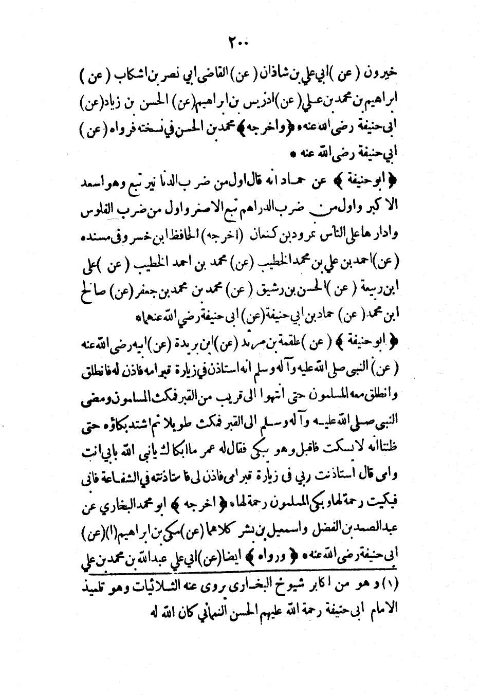 خيرون (عن) أبي علي بن شاذان (عن) القاضي أبي نصر بن اشكاب (عن) إبراهيم بن محمد بن علي (عن) إدريس بن إبراهيم (عن) الحسن بن زياد (عن) أبي حنيفة رضي الله عنه* (وأخرجه) محمد بن الحسن في نسخته فرواه (عن) أبي حنيفة رضي الله عنه*