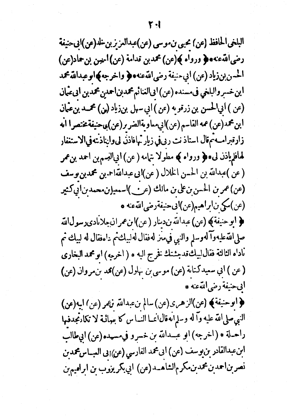 (أبو حنيفة) (عن) الزهري (عن) سالم بن عبد الله بن عمر (عن) أبيه (عن) النبي صلى الله عليه وآله وسلم أنه قال إنما الناس كإبل مائة لا تكاد تجد فيها راحلة* (أخرجه) أبو عبد الله بن خسرو في مسنده (عن) أبي طالب ابن عبد القادر بن يوسف (عن) أبي محمد الفارسي (عن) أبي العباس محمد بن نصر بن أحمد بن محمد بن مكرم الشاهد (عن) أبي بكر يزوب بن إبراهيم بن