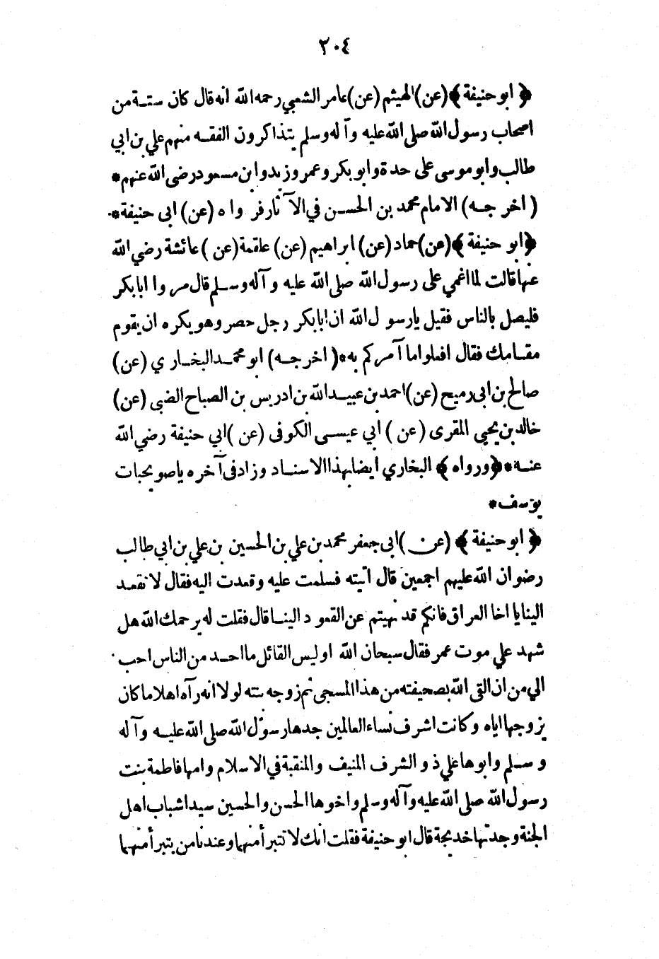 (أبو حنيفة) (عن) الهيثم (عن) عامر الشعبي رحمه الله أنه قال كان ستة من أصحاب رسول الله صلى الله عليه وآله وسلم يتذاكرون الفقه منهم علي بن أبي طالب وأبو موسى على حدة وأبو بكر وعمر وزيد وابن مسعود رضي الله عنهم* (أخرجه) الإمام محمد بن الحسن في الآثار فرواه (عن) أبي حنيفة* (أبو حنيفة) (عن) حماد (عن) إبراهيم (عن) علقمة (عن) عائشة رضي الله عنها قالت لما أغمي على رسول الله صلى الله عليه وآله وسلم قال مروا أبا بكر فليصل بالناس فقيل يا رسول الله إن أبا بكر رجل حصر وهو يكره أن يقوم مقامك فقال افعلوا ما آمركم به* (أخرجه) أبو محمد البخاري (عن) صالح بن أبي رميح (عن) أحمد بن عبيد الله بن إدريس بن الصباح الضبي (عن) خالد بن يحيى المقري (عن) أبي عيسى الكوفي (عن) أبي حنيفة رضي الله عنه* (ورواه) البخاري أيضاً بهذا الإسناد وزاد في آخره يا صويحبات يوسف*